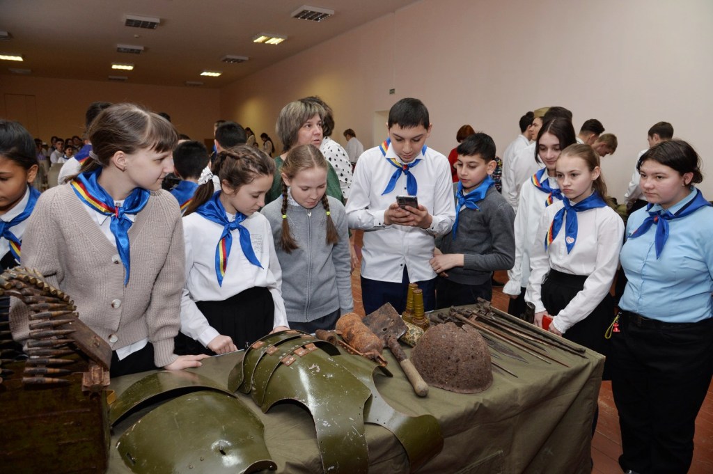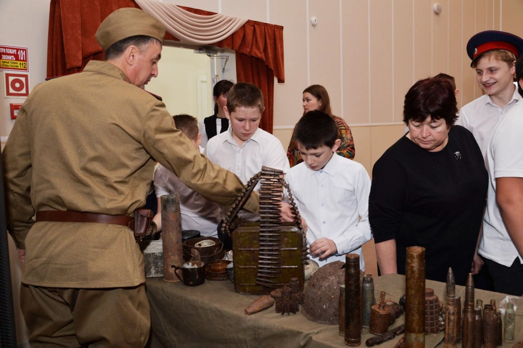 На «Уроки мужества» бойцы поискового отряда привезли выставку артефактов, найденных в ходе поисковых работ. Экспонаты можно было потрогать и даже примерить. Кроме того, ребятам показали документальное видео, снятое во время экспедиций.