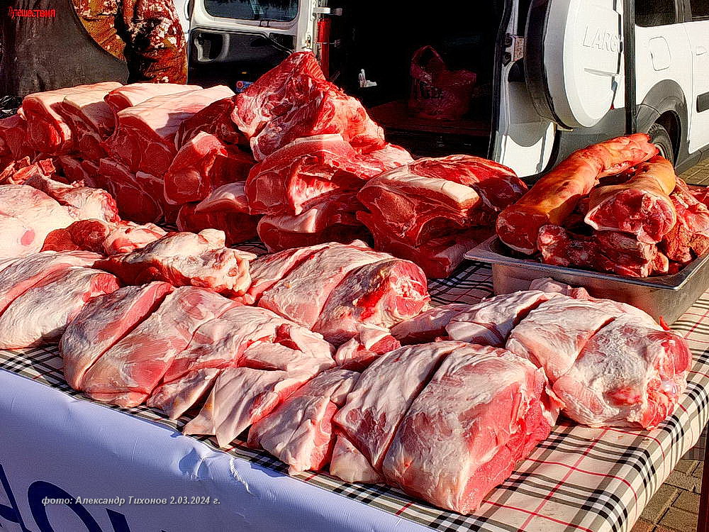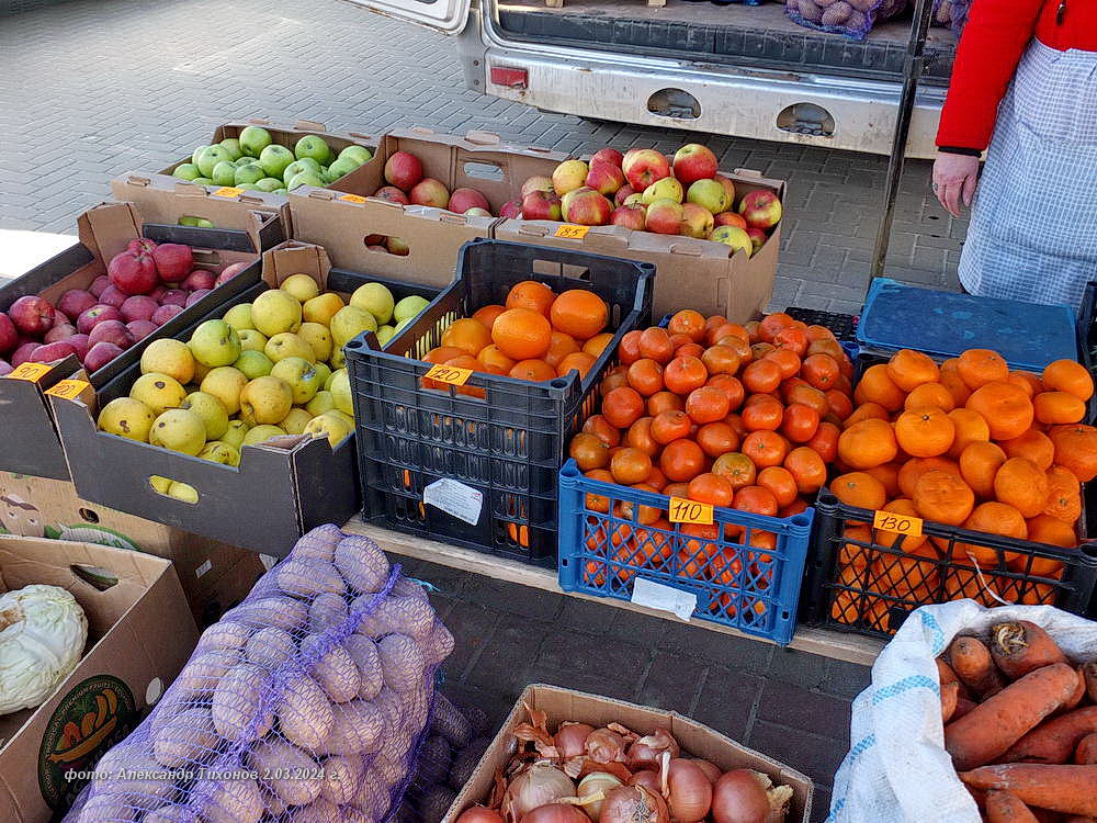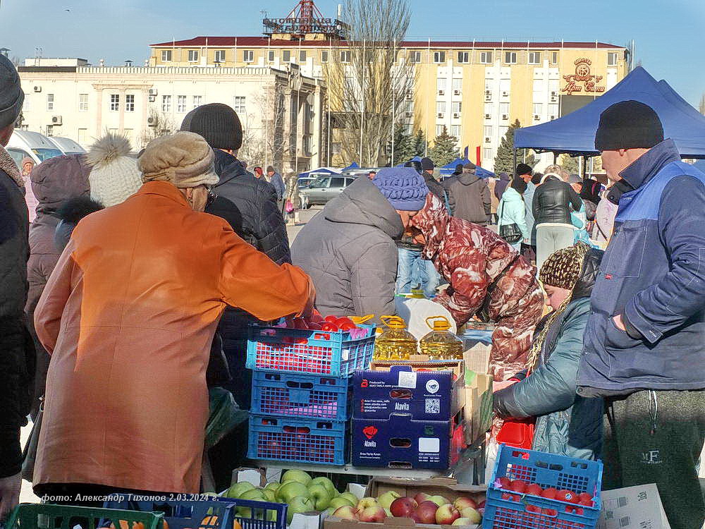 Как всегда большой ассортимент мяса, птицы, колбас, сыра и другой молочной продукции, рыбы и многое другое. На этой первой в этом году ярмарке торговцев было не так уж и много. Но главное — ярмарка препраздничная, но праздника не чувствовалось. Только вот весеннее солнышко слегка сглаживало грустное настроение, но сильный ветер и пыль делали лица людей хмурыми, а иногда и просто злыми. Что запомнилось. Ну мясо мне не по карману — обхожусь без него. Люблю яблоки. Но вот они сильно подорожали. Здесь их цена начиналась с 80 рублей. Рядом на рынке сегодня можно было взять и за 75. Кто-то скажет, что зарплаты, пенсии как поднялись. Да, но не у всех. Моей сестре, например, добавили к пенсии чуь-чуть больше 1 тысячи рублей. А таких стариков-пенсионеров с нищенской пенсией очень много. Сейчас все обсуждают послание нашего президента. Так вот, в этом послании ни слова о пенсионерах… Но это так, к слову… А яблоки я купил на соседнем рынке.