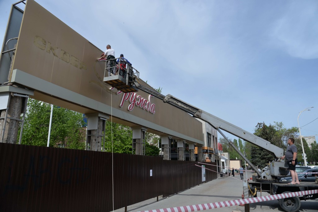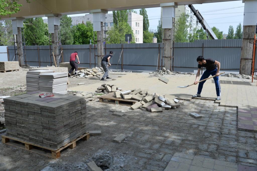 Активная фаза работ на объекте началась в середине апреля – идет демонтаж архитектурных сооружений входной группы сквера, тротуарной плитки, поребриков.