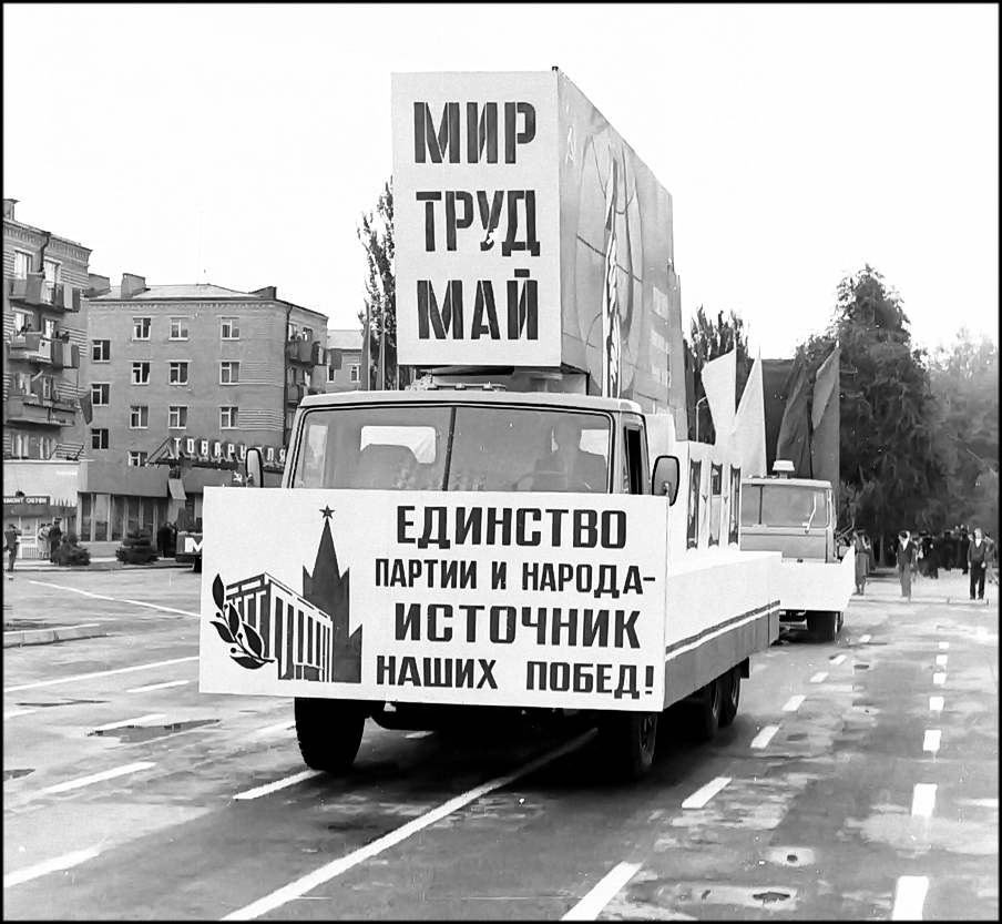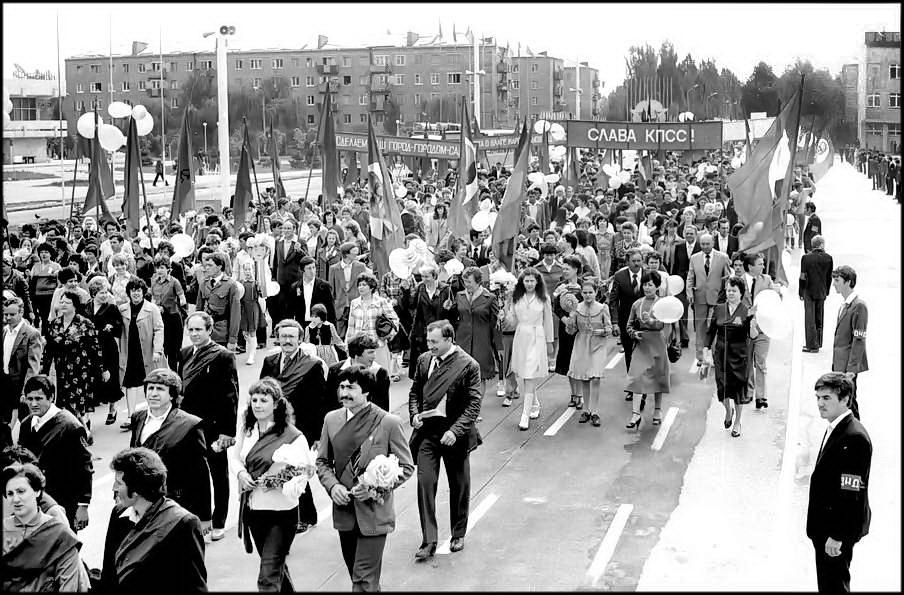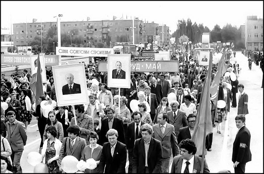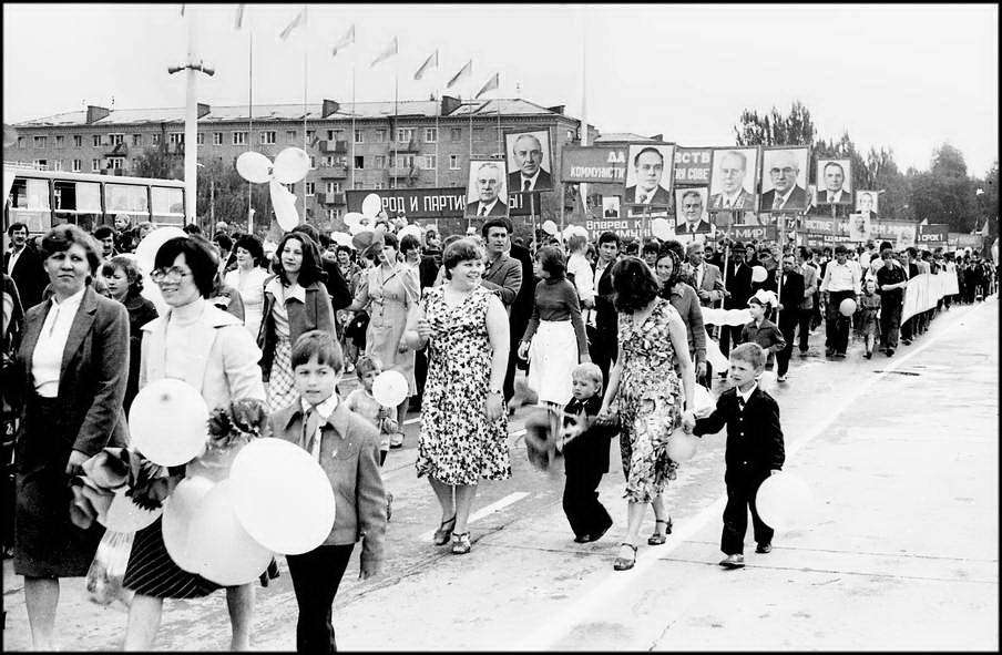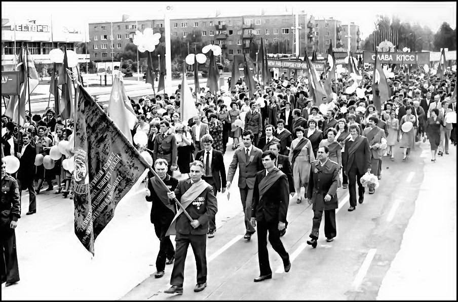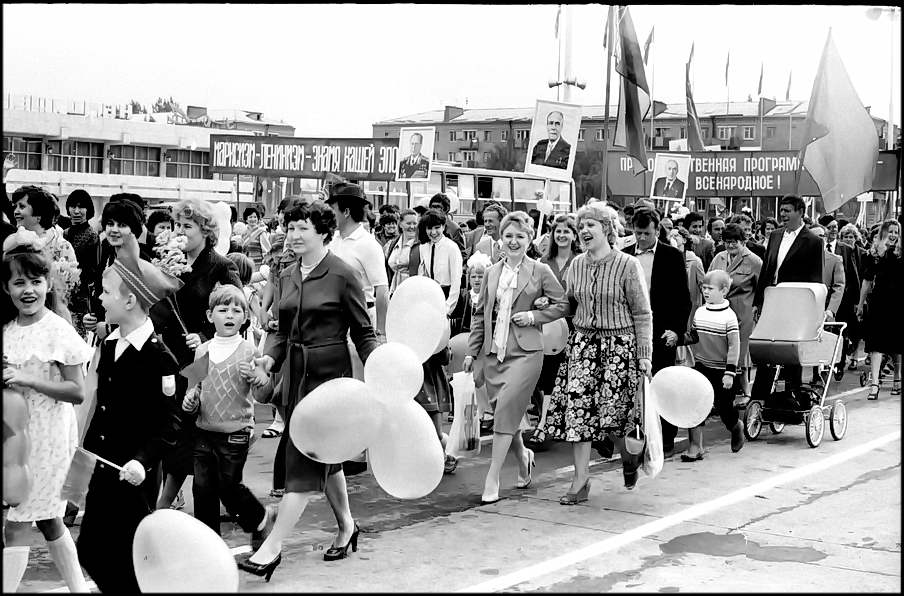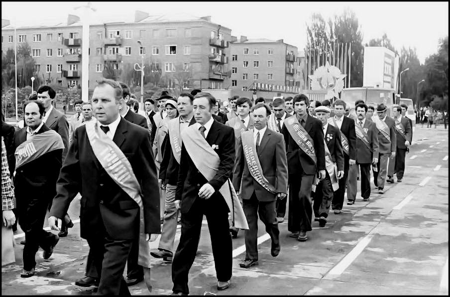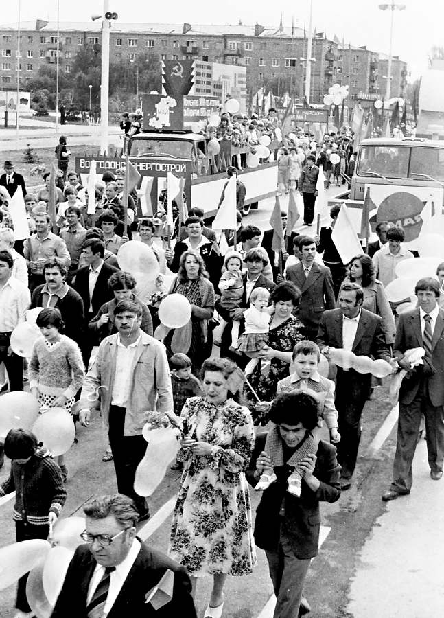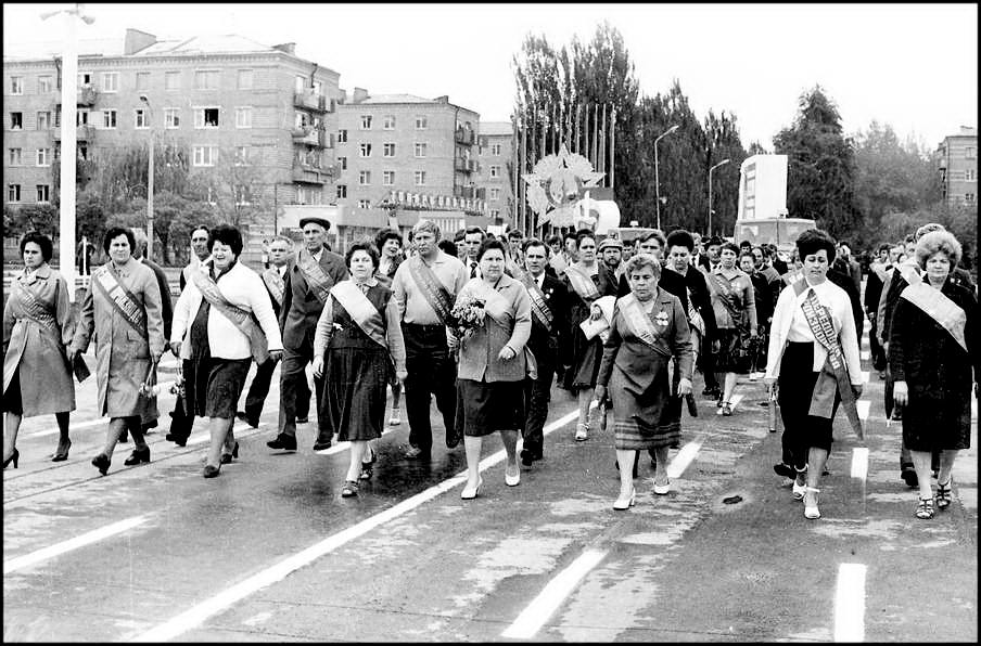 В колонне передовиков идут атоммащевцы А.С. Атаманов, Г.Ф. Емельяненко, воэзовцы Н.Н. Ревенко, А.М. Деев. Здесь же учителя, работники химзавода имени 50-летия ВЛКСМ, лесоперевалочного комбината, службы быта и торговли, транспорта и медицинского обслуживания.