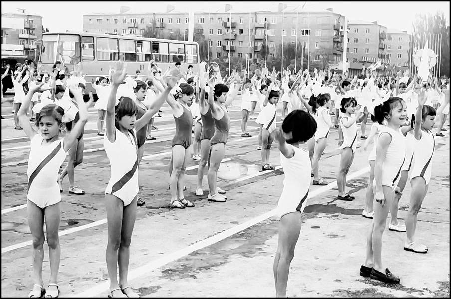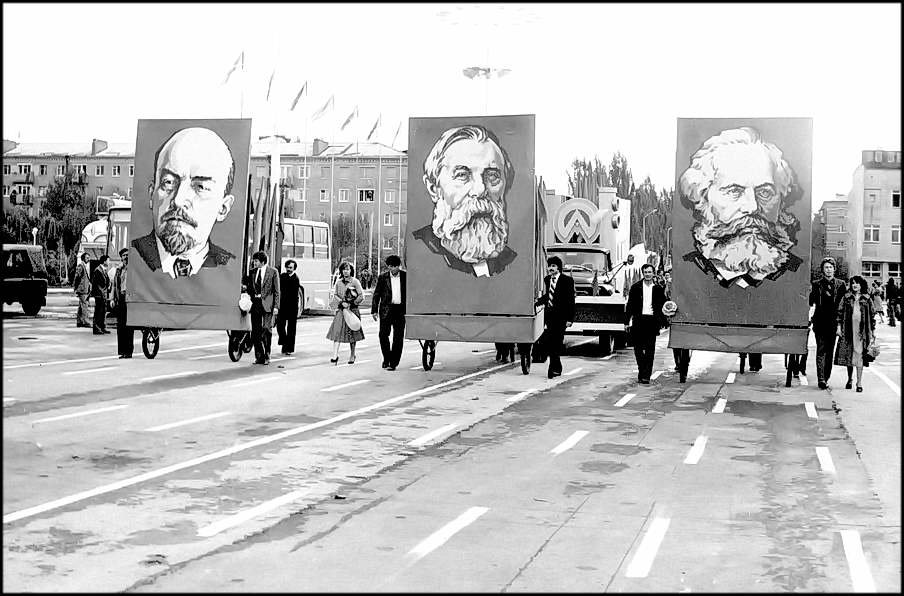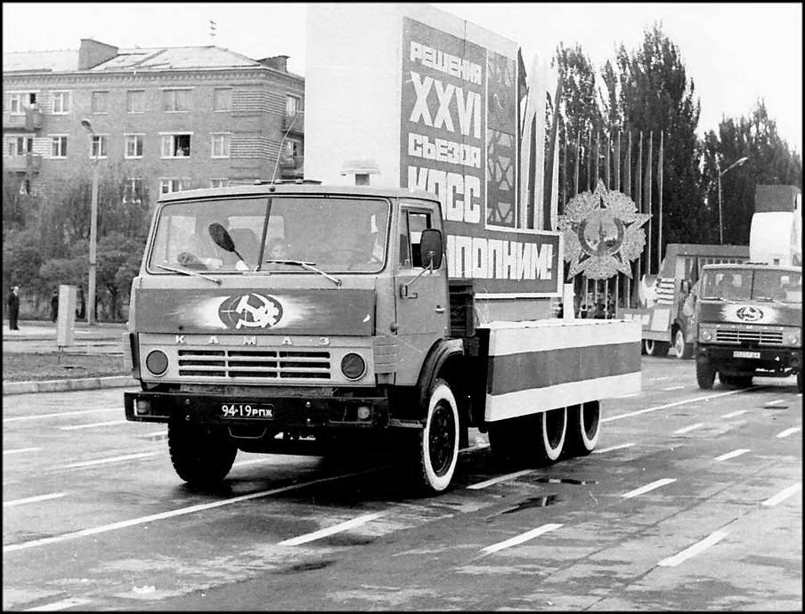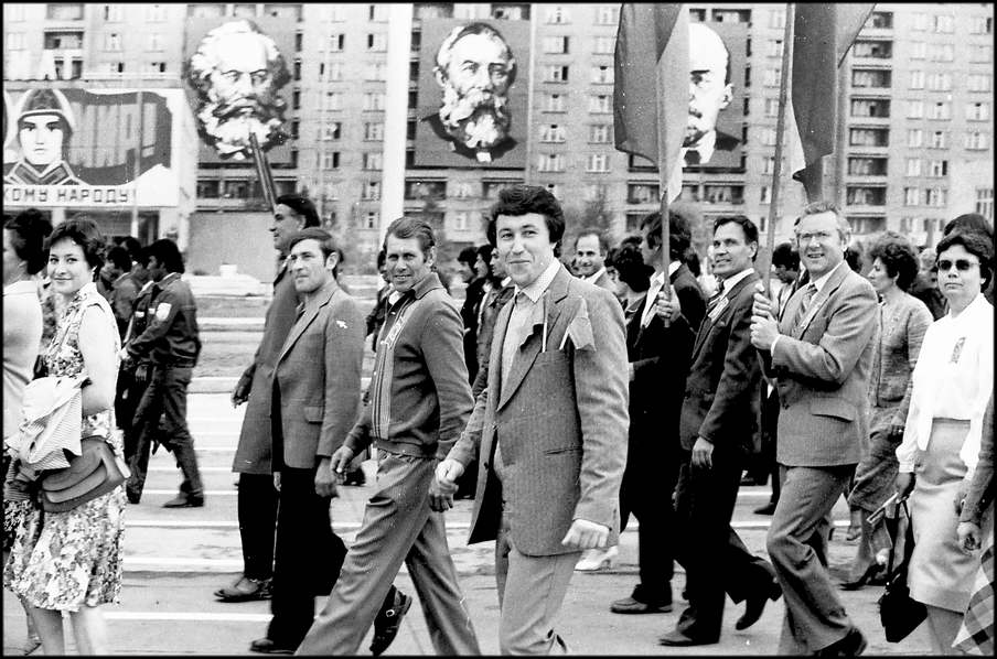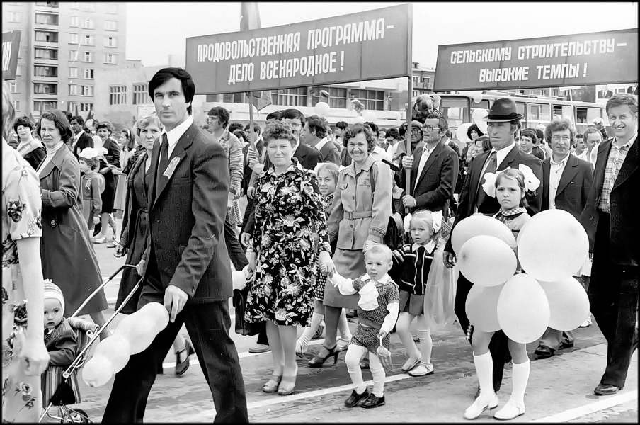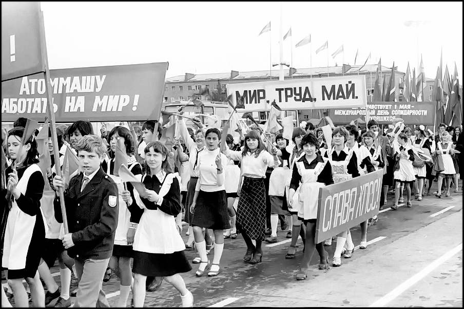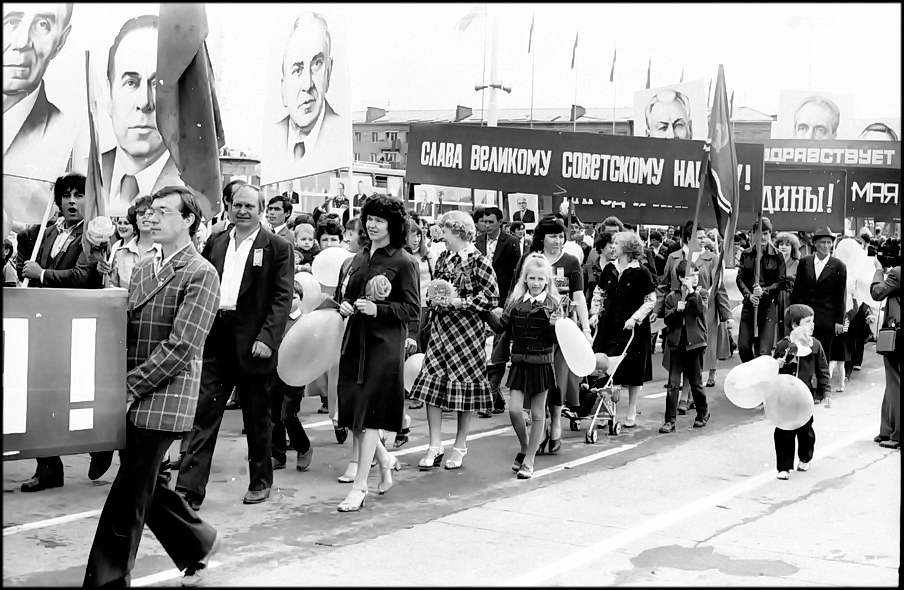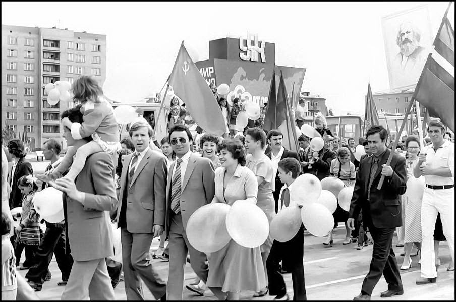 В колонне передовиков идут атоммащевцы А.С. Атаманов, Г.Ф. Емельяненко, воэзовцы Н.Н. Ревенко, А.М. Деев. Здесь же учителя, работники химзавода имени 50-летия ВЛКСМ, лесоперевалочного комбината, службы быта и торговли, транспорта и медицинского обслуживания.