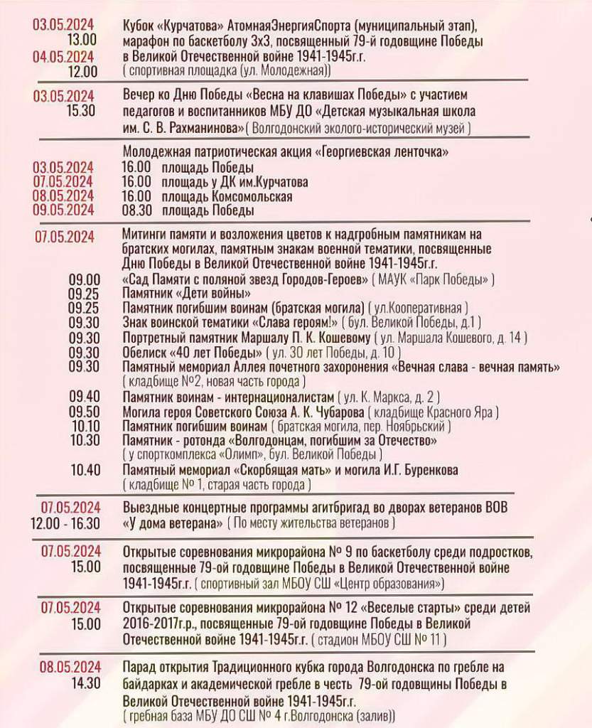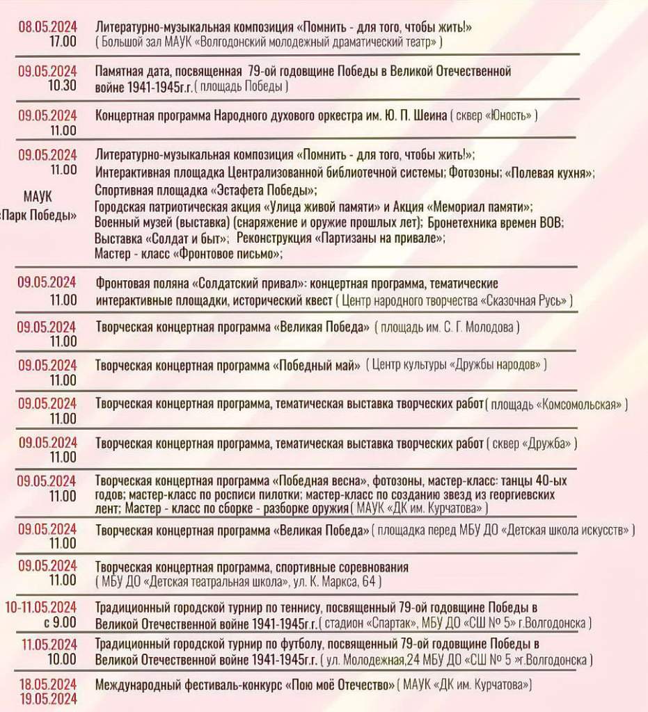 Площадками для проведения праздничных мероприятий станут: сквер «Юность», Парк Победы, здание Центральной библиотеки на Ленина, 75; сквер Молодова; центр Дружбы народов (Красный Яр, ул. Центральная, 46), площадь Комсомольская, сквер «Дружба», центр Народного Творчества «Сказочная Русь» в бывшей Старосоленовской (пер. Ноябрьский, 13а), парапет ДК им. Курчатова», Детская школа искусств по ул. М. Кошевого, 38; многофункциональная спортивная площадка в переулке Лазоревый, 28.