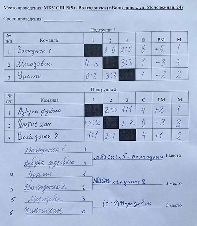 В итоге 1 место зняла команда «Волгодонск-1». На втором месте команда «Узбука футбола» из футбольной школы А.Гермашова.И третий результат показала вторая команда из спортивной школы №5 Волгодонска.