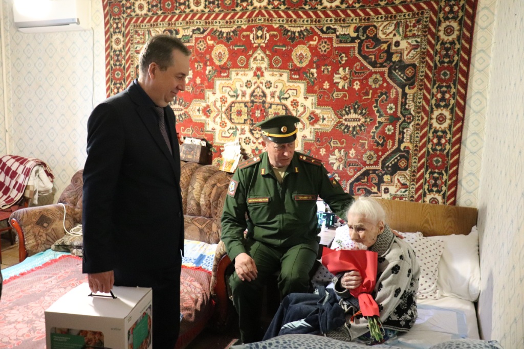 Когда труженица тыла, 98-летняя Валентина Петровна Родионова увидела в комнате гостей с подарками и цветами, представителя военного комиссариата в военной форме, она сразу же растрогалась, не смогла сдержать слез. Война застала Валю еще совсем юной девочкой, семиклассницей, но быстро заставила повзрослеть. Приходилось голодать и видеть страшные смерти от голода близких людей. Как нам рассказала дочь труженицы тыла, Галина Алексеевна, ее мама — много работала с детства и после войны занималась восстановлением сельского хозяйства. Когда вышла замуж за офицера, участника ВОВ, много переезжала с ним. Ее муж — Алексей Маркович был призван в 1943 году — его вместе с целым классом парней посадили в грузовик, чтобы доставить на распределение в Ростов-на-Дону, а по дороге на них сбросили немецкий десант: из класса выжили только два человека, они успели спрятаться кустах. Закончил войну Алексей Маркович в Варшаве, был тяжело ранен. А после отставки в чине подполковника, он принял решение уехать с семьей в Волгодонск, так как сам он местный — из Мартыновского района, и друзья очень сильно звали в родные места. В Волгодонске мужчина работал в местной администрации в наградном отделе. Отголоски ран времен войны и стали причиной раннего ухода ветерана войны. Сегодня Валентина Петровна Родионова живет в окружении заботы и любви с двумя дочерьми и часто вспоминает мужа, рассказывает истории из своей жизни. Всегда со слезами на глазах.