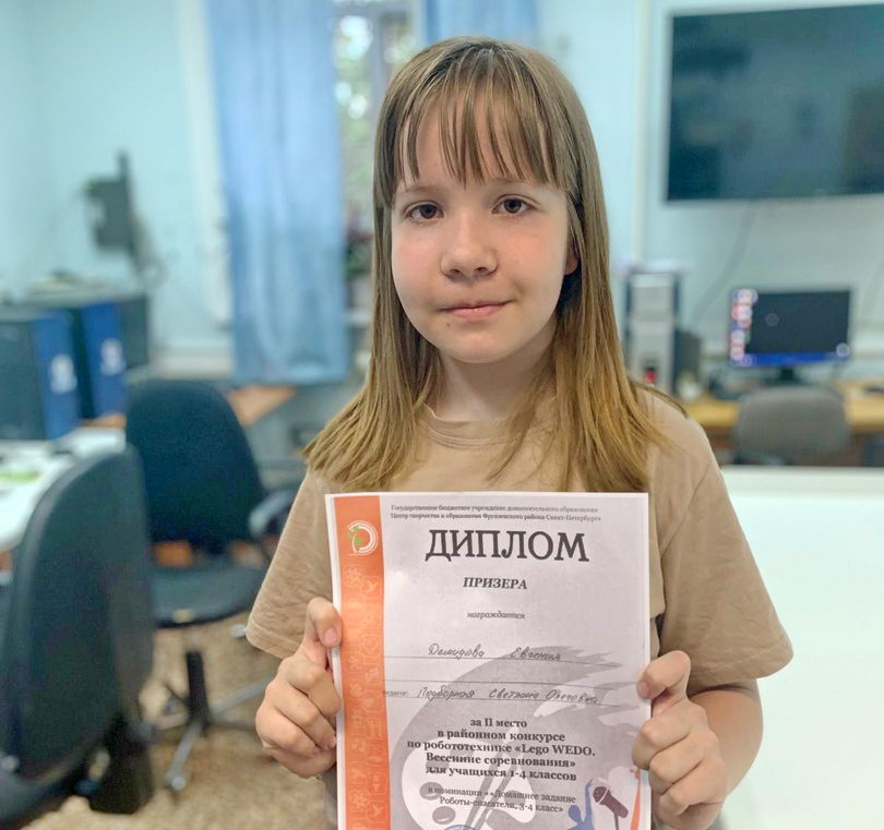 Четвероклассница Евгения Демидова совершила заочное путешествие в ГБУДО ЦТиО Фрунзенского района Санкт-Петербурга, где проходил открытый районный конкурс по робототехнике «Lego WEDO. Весенние соревнования». Школьница участвовала в категории Домашнее задание Lego Wedo. Она представляла робототехнический проект «Камнеубиратель» — робот, который помогает сотрудникам МЧС во время камнепада. Жюри высоко оценило работу волгодончанки и удостоило ее дипломом за второе место в номинации «Домашнее задание. Роботы – спасатели, 3-4 класс».