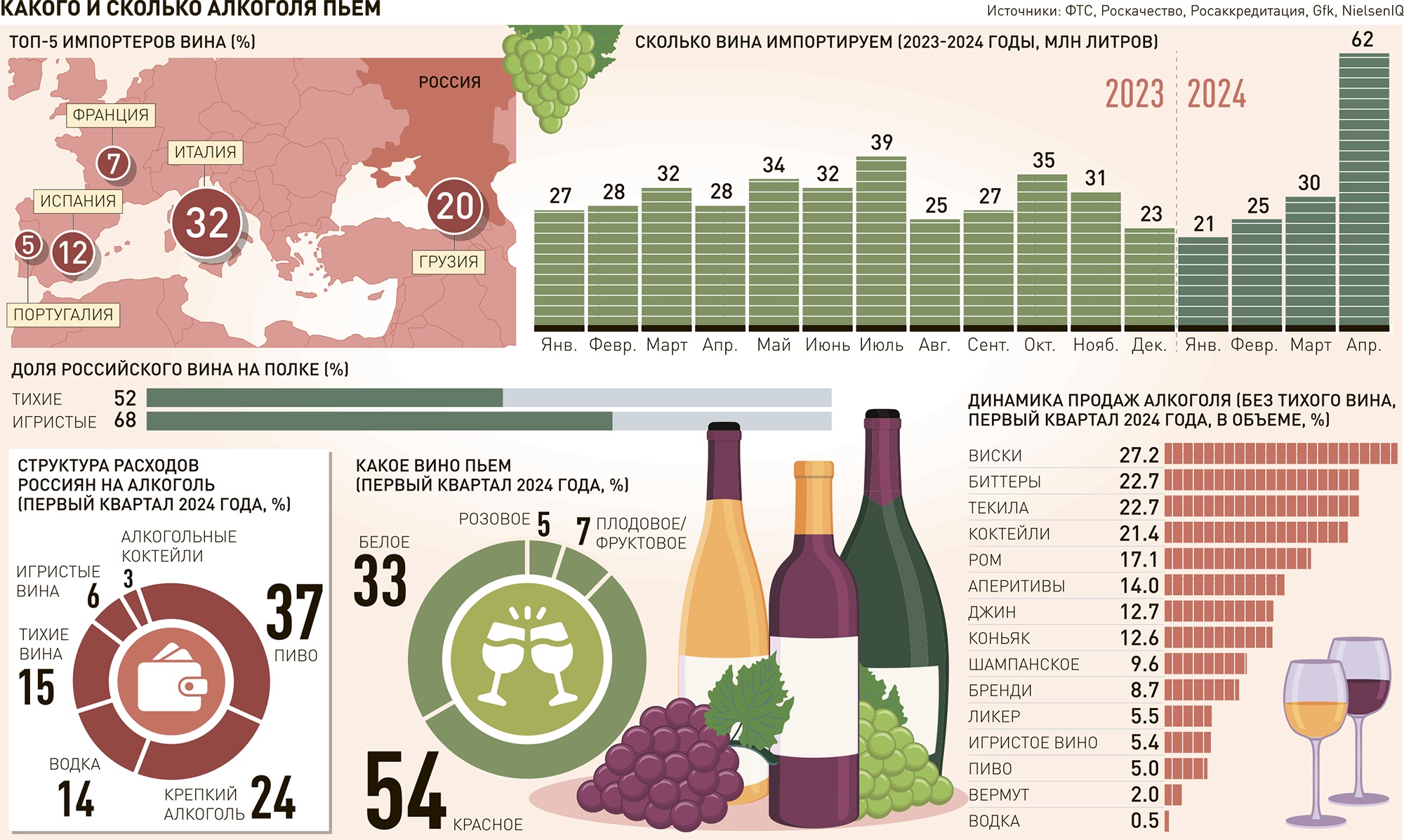 Если в апреле прошлого года их было импортировано в Россию 18 млн литров, то в апреле этого года — 35 млн литров. В сравнении с мартом 2024 года он подскочил более чем вдвое (с 16 млн литров). Правда, свое влияние оказало повышение акцизов на вина (как импортные, так и российские) втрое с 1 мая 2023 года — импортеры постарались завезти максимум по прежней цене.