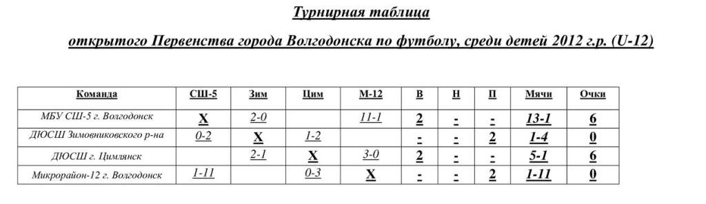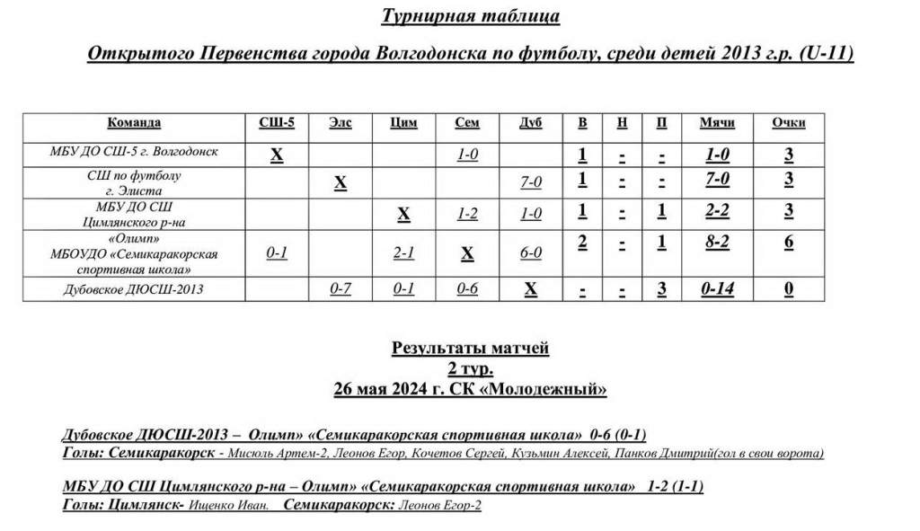 25 мая играли ребята 2012 года рождения (U-12). Юные футболисты спортивной школы № 5 Волгодонска выиграли со счётом 2: 0 у сверстников из ДЮСШ Зимовниковского района. Голы забили Эдик Снытко и Артём Лазурченко. Это была игра 3 тура.