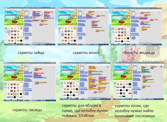 -Я решил сделать игру по мотивам русской народной сказки «Колобок», потому что эта сказка и герои известны всем детям с раннего детства. Родители читают ее своим детям с младенчества и она очень любима. Цель моей игры — воспитывать любовь и интерес к русским народным сказкам, пословицам, развитие логики, внимания, эрудиции и сообразительности. Для этого я изучил правила работы в Scratch 2.0, разработал сценарий и реализовал его в среде Scratch 2.0. Практическая значимость работы заключается в том, что игру могут использовать дошкольники и учащиеся начальной школы. Колобок, испеченный бабушкой, убежал в лес полный опасностей. В сказке Колобка встречали животные, которые хотели его скушать и говорили колобку: «Колобок, Колобок, я тебя съем!», но колобок убежал от зайки, волка и медведя, а лисичка хитрая заманила на язычок и проглотила. Эту сказку слышали все детки. Эта яркая и красочная игра обязательно понравиться ребятам, где в главной роли колобок. Для того чтобы колобок мог убежать от зайки, волка, медведя и лисы, нужно правильно выполнять задания героев. Участник может сам играть без помощи родителей, так как в игре озвучиваются задания. Я и моя семья помогали в озвучивании игры. В этой развивающей игре участник должен пройти 4 уровня. Ребятам нужно помочь колобку убежать от животных, которые хотят его съесть. Для этого нужно правильно выполнять задания героев, например: у зайца пройти лабиринт, у волка собрать 10 яблок, у медведя найти тень объекта, у лисы найти продолжение пословицы. Для успешного прохождения игры ребенок использует мышку и стрелки на клавиатуре «вверх», «вниз», «вправо», «влево». Так же есть инструкция для прохождения игры. На основе этой игры можно придумать и реализовать другие сценарии и увлечь программированием.