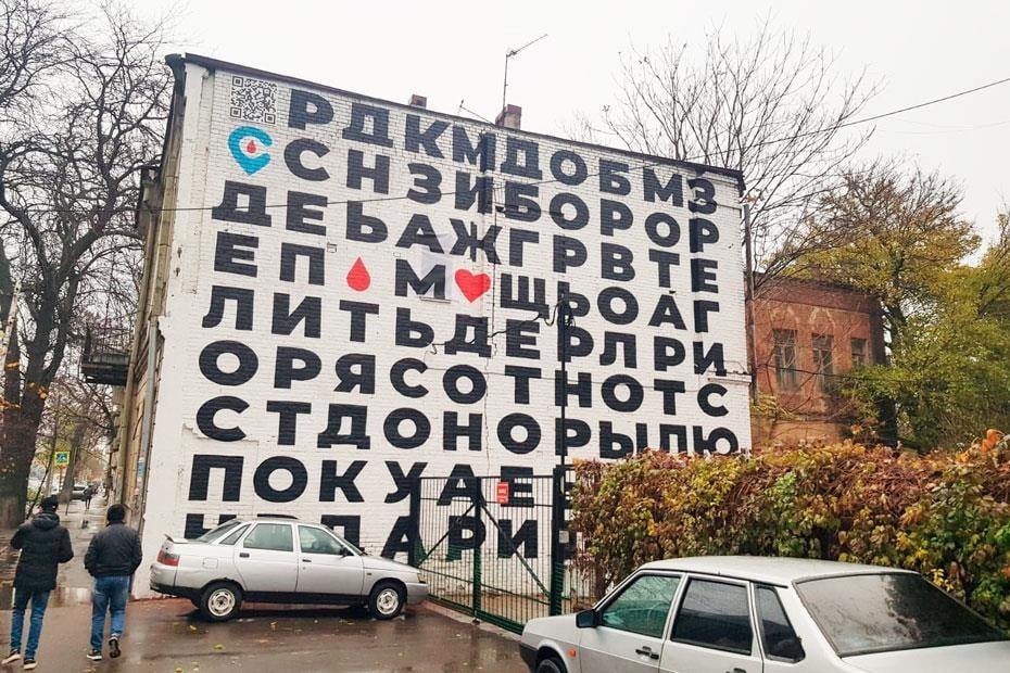 Кроссворд по типу венгерского теперь можно разгадать на стене дома в ростовском районе Нахичевань по адресу ул. 1‑я Майская, 14б. В нем зашифровано 12 добрых слов, связанных с донорством, в том числе пара аббревиатур. Мурал создавали совместно Донской волонтерский центр, организация «Молодые медики Дона» и ростовский областной Комитет по молодежной политике.