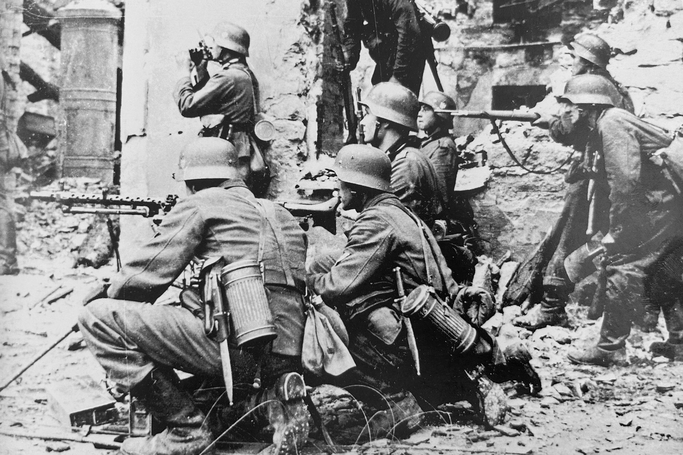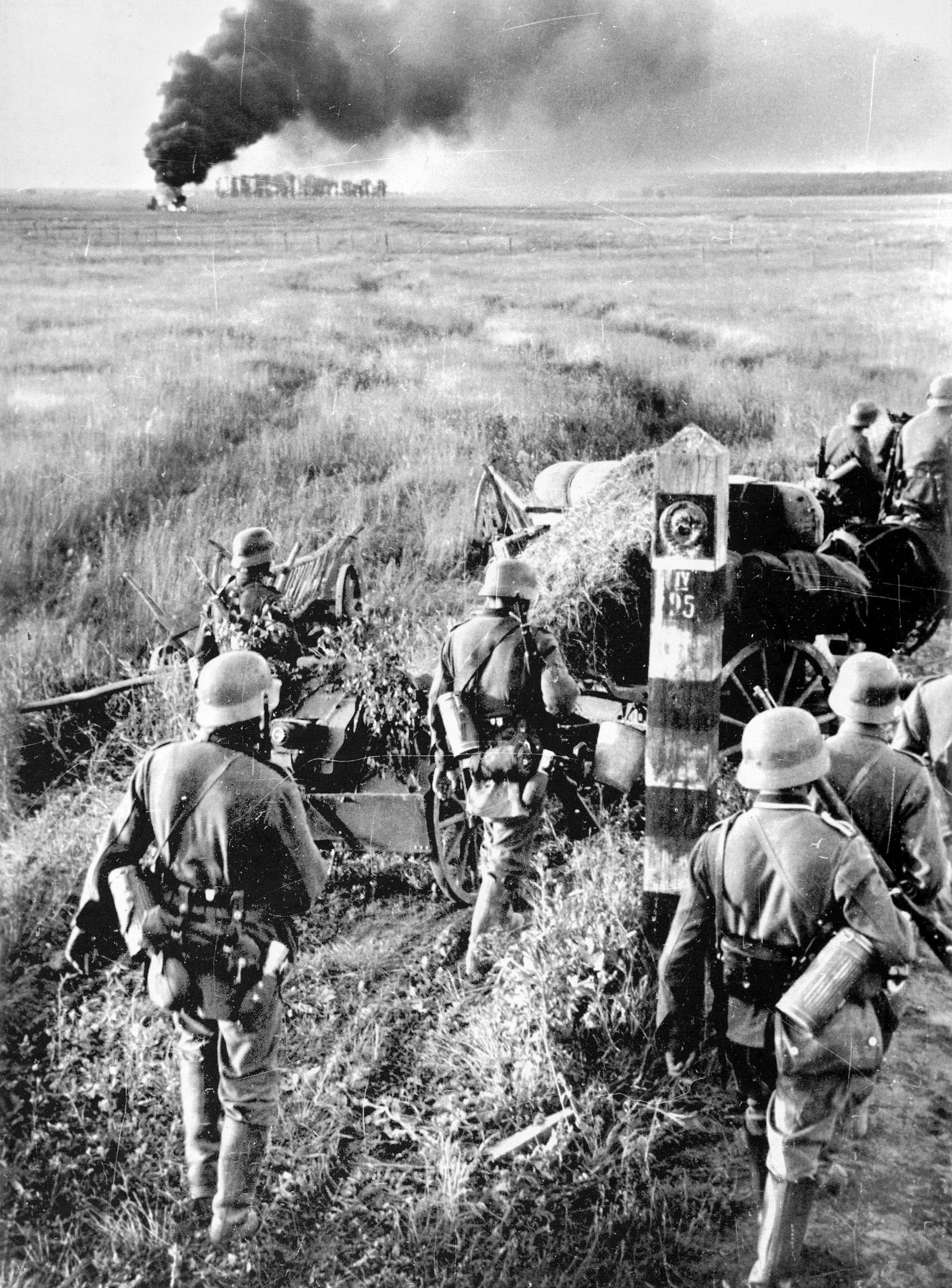Вермахт штурмует украинские хаты, 1941 год, фотограф Хеле. Снимок нуждается в пояснении: наверное, это какая-то очень важная для германского командования и лично для Гитлера хата, поскольку ее захватывают силами… целого пехотного взвода. Дело в том, что в объектив попали аж два пистолета-пулемета. На взвод (по штатам 1941 года это 49 человек!) было всего пять пистолетов-пулеметов: по одному у командира взвода и у командиров отделений. Т.е. перед вашими глазами «атака командиров». Интересно, а что в это время делают их подчиненные? Впрочем, есть и более простое объяснение: автор снимка — профессиональный пропагандист вермахта фотограф Иоганн Карл Хеле. Видимо, Иоганну очень хотелось подчеркнуть техническое превосходство своей армии. Кстати, Хеле загадочный персонаж. Автор многих незаурядных фотографий, снимал бои во Франции, СССР, в Африке. Бесследно исчез в Бельгии летом 1944-го. Его жена (или вдова) после войны торговала фотографиями мужа, в том числе и съемкой казней в Бабьем Яру. Фото он тайно посылал домой, нарушая приказы командования.
