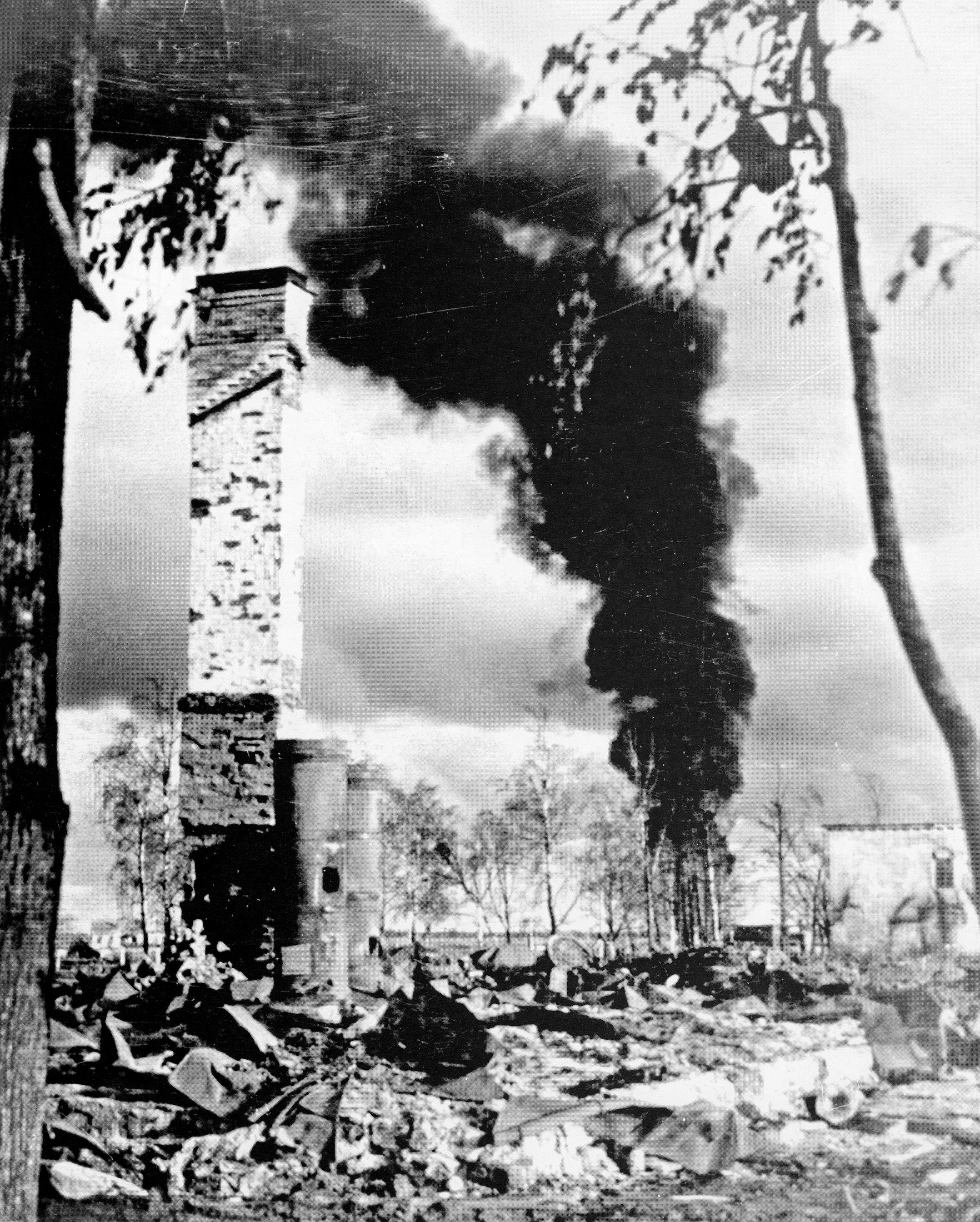 Разрушенная белорусская деревня. Такие фотодокументы в памяти любого «рожденного в СССР» ассоциативно связаны с Хатынью. Но надо помнить, что трагедия Хатыни разыгралась уже в середине войны: в марте 1943 года. Каратели сожгли деревню вместе со всеми ее жителями. Но Хатынь была не первой и не последней. Только на территории Беларуси сотни деревень сожгли вместе с населением. А всего гитлеровцы уничтожили в СССР 70 тысяч деревень. Сожженная белорусская деревня, что перед вашими глазами, боюсь, останется в мировой истории безымянной. Фотографировал ее немец, названия высокомерно не зафиксировал.