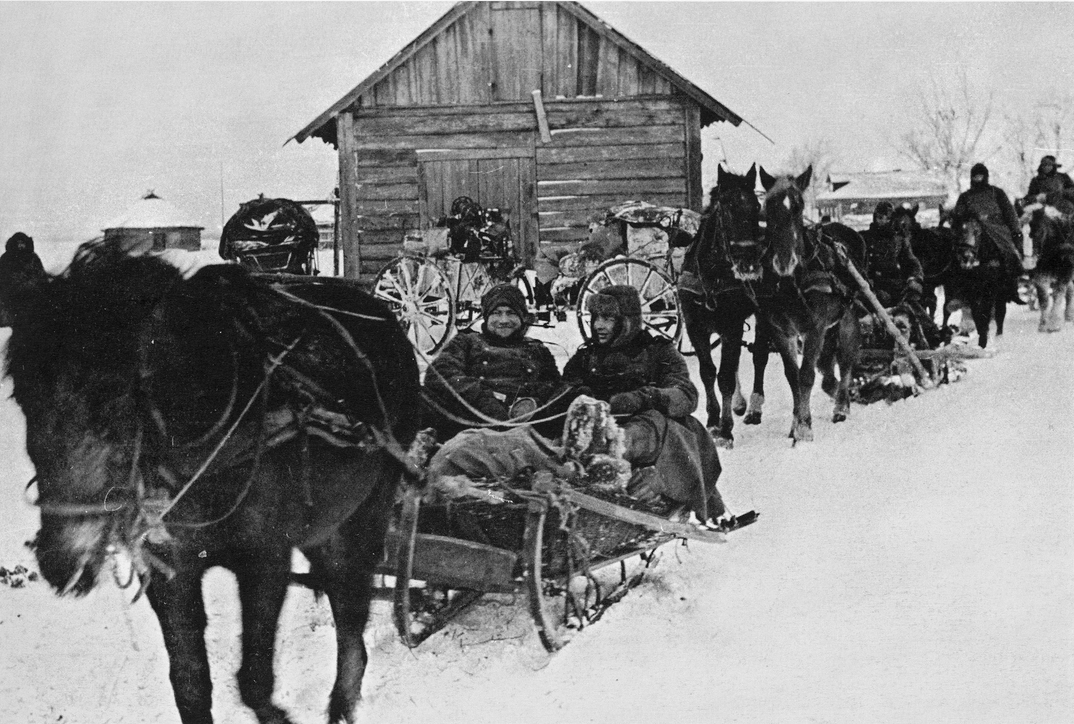 Если не читать описания, то можно подумать, что перед вами что-то вроде зимнего сельского праздника: конные повозки, улыбающиеся ездоки… Все так и есть: праздник. Январь 1942-го: немецкие войска, обломав зубы о Москву, драпают. Чего вот только у них улыбки от ушей, как у дураков? Ну так своим же позируют. Вроде того: не драпаем, а тактически перемещаемся. А вот займем более выгодное положение — снова пойдем в наступление. Нет, не судьба, не пойдут они больше на Москву. Не по зубам она.
