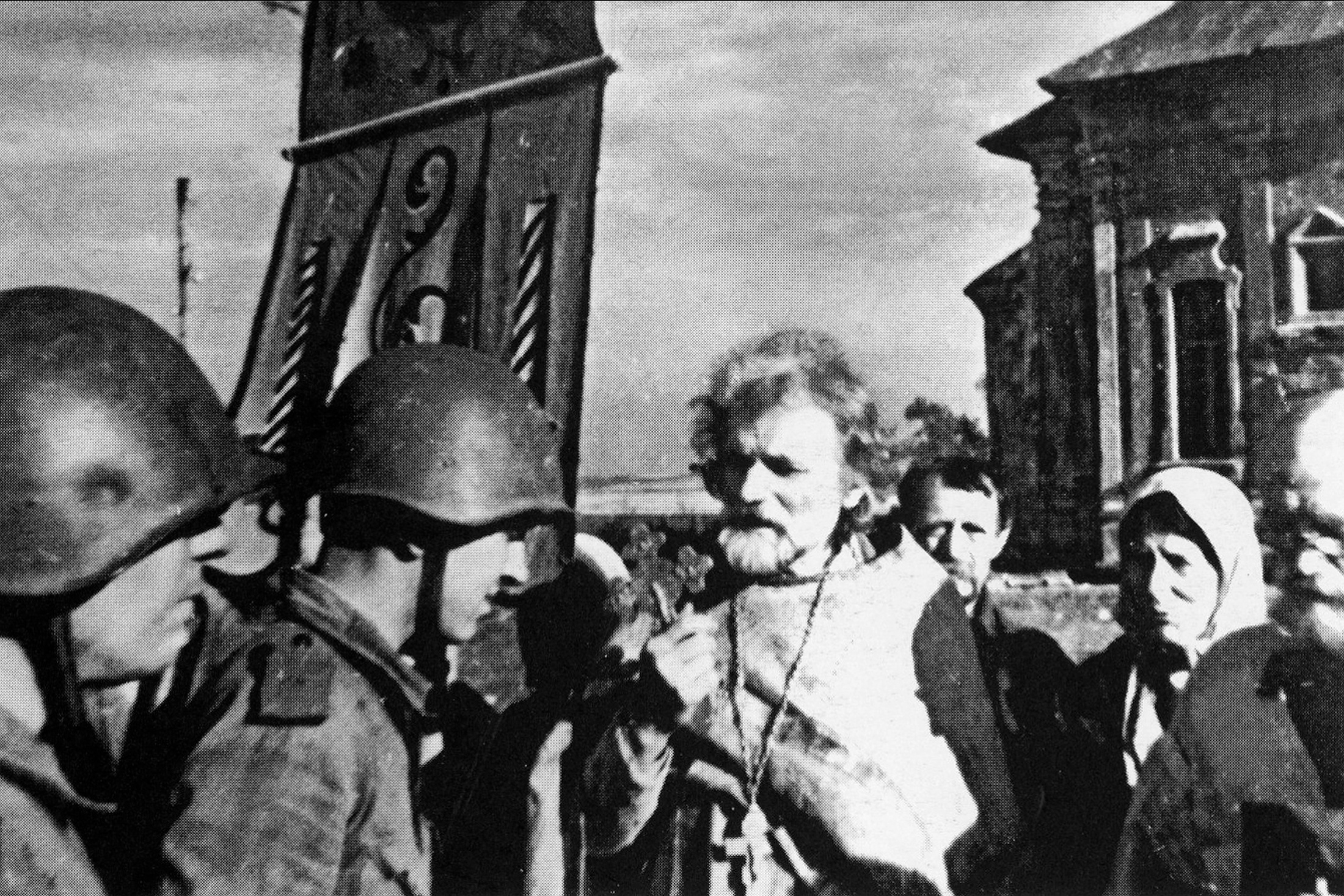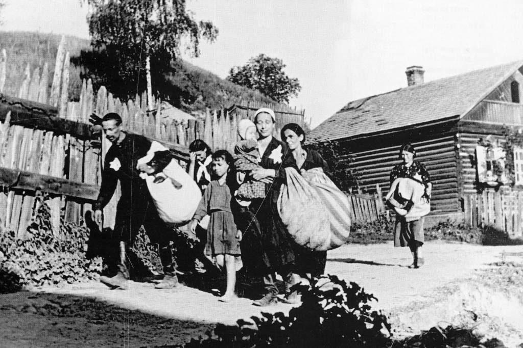 Еврейская семья по дороге в гетто, Беларусь, 1941 год. Всего в Беларуси нацистами за время войны (с 1941 года до освобождения республики в 1944 году) были убиты от 600 до 800 тысяч евреев. В гетто узники были обречены на полуголодное существование. Их заставляли работать без оплаты или выдавали паек в два раза меньше самых низких норм, полагавшихся за принудительный труд.