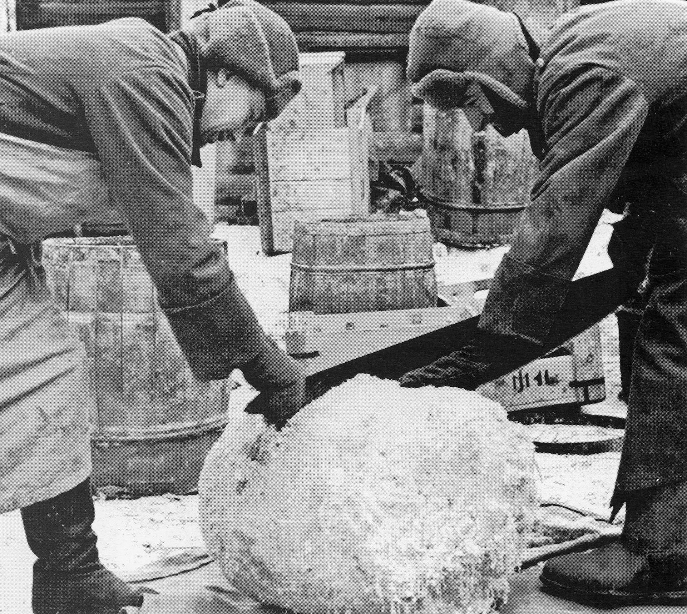 Немецкие солдаты пилят на оккупированной советской земле замерзшую квашеную капусту. Фотограф Вейземанн. Автор не указал место съемки и весьма вольно написал время: 1941 — 1944 год. Странно, но подобный сюжет повторяется у многих немецких фронтовых хроникеров. Другие лица, другая пила, но все пилят зимой капусту. Мания какая-то? Или им кажется, что это весело и жизнеутверждающе? Странно, если бы нечто подобное сняли наши фронтовые репортеры, то, боюсь, цензура бы не пропустила. Впрочем, наши не сняли бы: в Германии таких зим нет. Вот и ели бы свои баварские колбаски с тушеной капустой, не совались бы к нам.