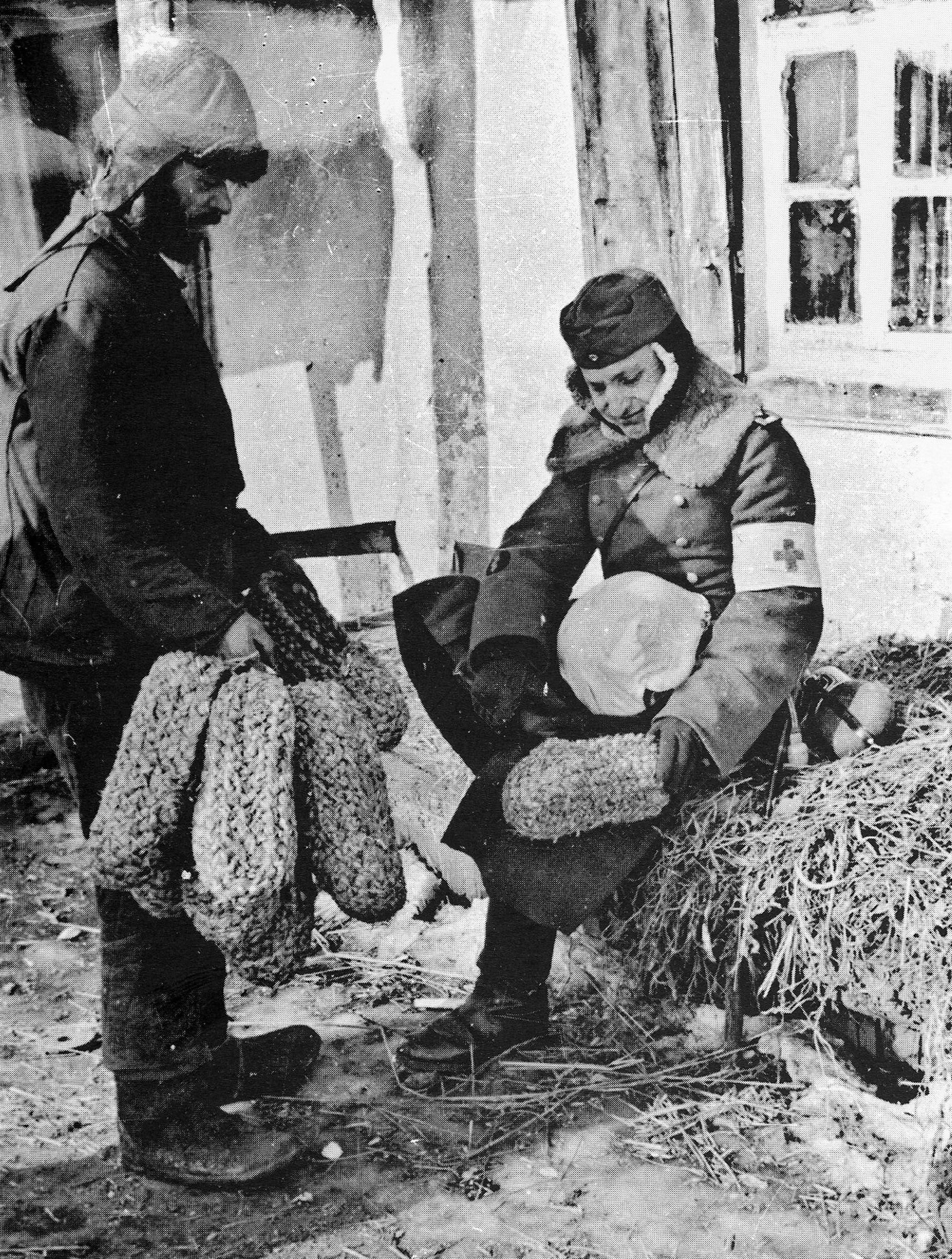 Немецкий санитар-фельдфебель примеряет соломенную обувь (так в описании), изготовленную украинским крестьянином. Проще написать: вермахт осваивает лапти. Кстати, огромный модельный ряд, их плели не только из соломы, но и из лыка, бересты, кожаных ремешков, из коры деревьев (лучшие из дуба, худшие из ивы). Если собрать гитлеровцев под Сталинградом, обутых в русские лапти, получится целый альбом. Но выбор был невелик: или отмороженные и ампутированные ноги, или лапти и валенки. Они к нам вторглись, не имея полноценной зимней формы и обуви.
