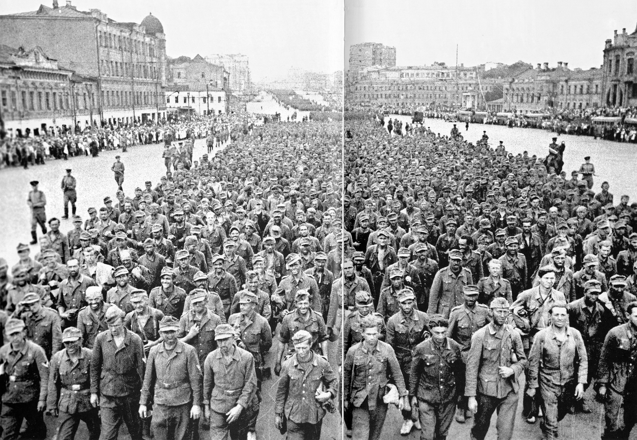 Они шли на Москву. Дошли. Колонна немецких пленных на Садовом кольце, 17 июля 1944 года. Высшим руководством было принято решение провести 57 000 немецких солдат и офицеров по Садовому кольцу и другим центральным улицам столицы СССР. Операцию назвали «Большой вальс». Отбирали только здоровых и накануне марша пленных хорошо накормили: каша, сало, хлеб. Но жирная пища и сорокоградусная жара сыграли плохую шутку: у многих случилось несварение желудка, туалетов не было, гитлеровцы справляли нужду в штаны или на асфальт. Пришлось вызывать поливальные машины…