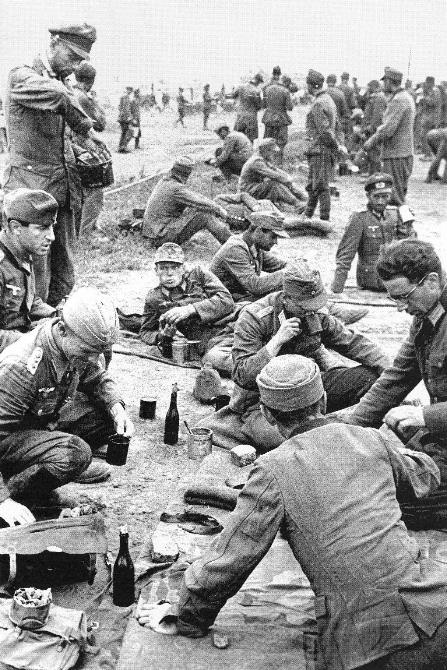 На стороне Германии воевали 2 млн. человек из 15 стран Европы. А с учетом добровольцев (их страна как бы не воюет, но дает нацистам пушечное мясо) — 32 национальности. Яркий тому пример эта фотография. Испанские офицеры 250-й пехотной дивизии в перерывах между боями. Осень, 1941 год, бои за Ленинград. На испанском название дивизии звучит как División Azul, на немецком — Blaue Division. Мы перевели название как Голубая дивизия. Правильнее, наверное, было перевести «синяя» (солдаты носили синие рубашки), но… впрочем, какая разница? Ну, называли бы не «голубыми», а «синяками», и что хуже? А хитрость в том, что испанская Голубая дивизия против нас воевала, а Испания — нет. Диктатор Франсиско Франко занял положение вооруженного нейтралитета, официально его страна союзником Германии не была, Испания войну СССР не объявляла. В 1943 году Голубую дивизию вернули на родину. Но часть испанцев осталась воевать в частях вермахта.