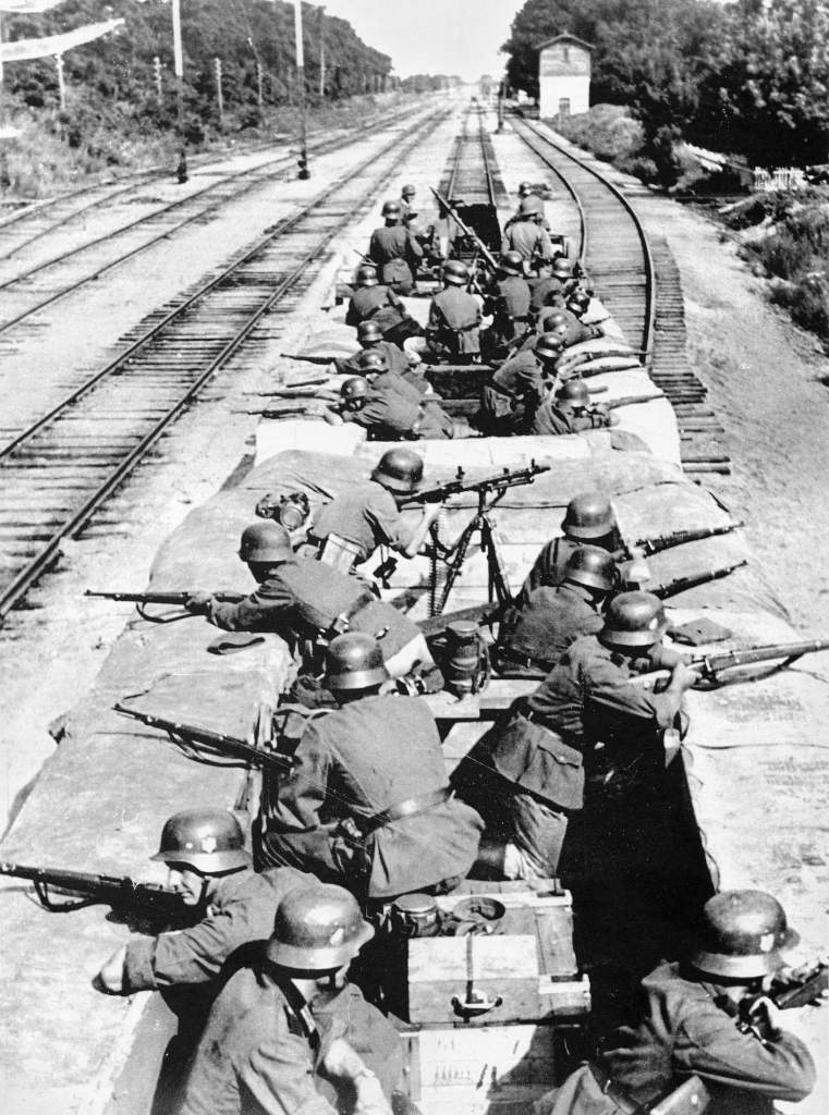 Немецкая воинская часть на железнодорожной платформе в зоне действия партизанского отряда. Место и время съемки неизвестны. Но точно — фото не постановочное. Боятся наших партизан. Очень боятся!