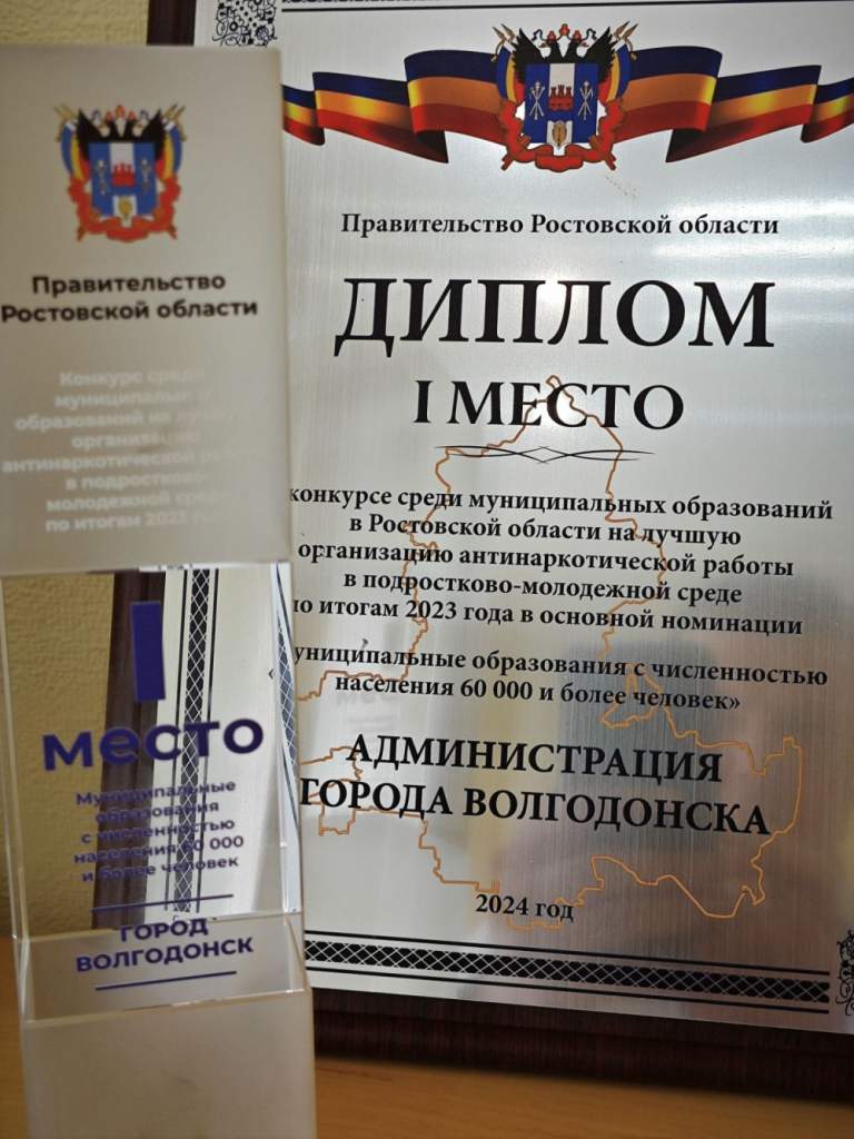 В правительстве Ростовской области подвели итоги конкурса среди муниципальных образований региона на лучшую организацию антинаркотической работы в подростково-молодежной среде. Администрация города Волгодонска заняла I место в номинации «Муниципальные образования с численностью населения 60 тысяч человек и более», опередив Ростов-на-Дону и Константиновск.