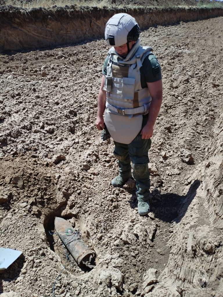 Пиротехнический расчет Донского спасательного центра МЧС России уничтожил опасную находку, подорвав ее прямо в поле.