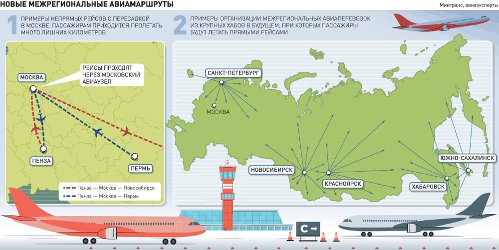 В первом внимание уделяется развитию межрегиональных перевозок из крупных хабов — например, Новосибирска, Красноярска, Хабаровска, Южно-Сахалинска, Калининграда и Санкт-Петербурга — в регионы. Благодаря развитию этих и подобных им авиаузлов возможно будет выстраивать прямые авиарейсы в регионы, полагает руководитель портала «Авиация России» Андрей Величко.