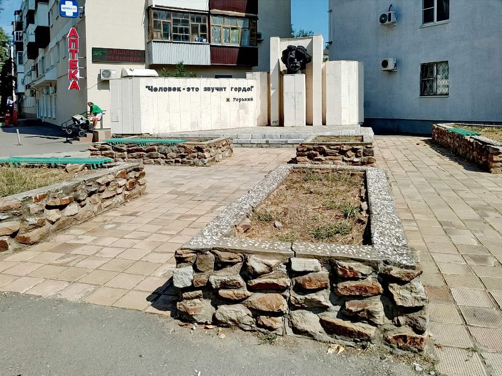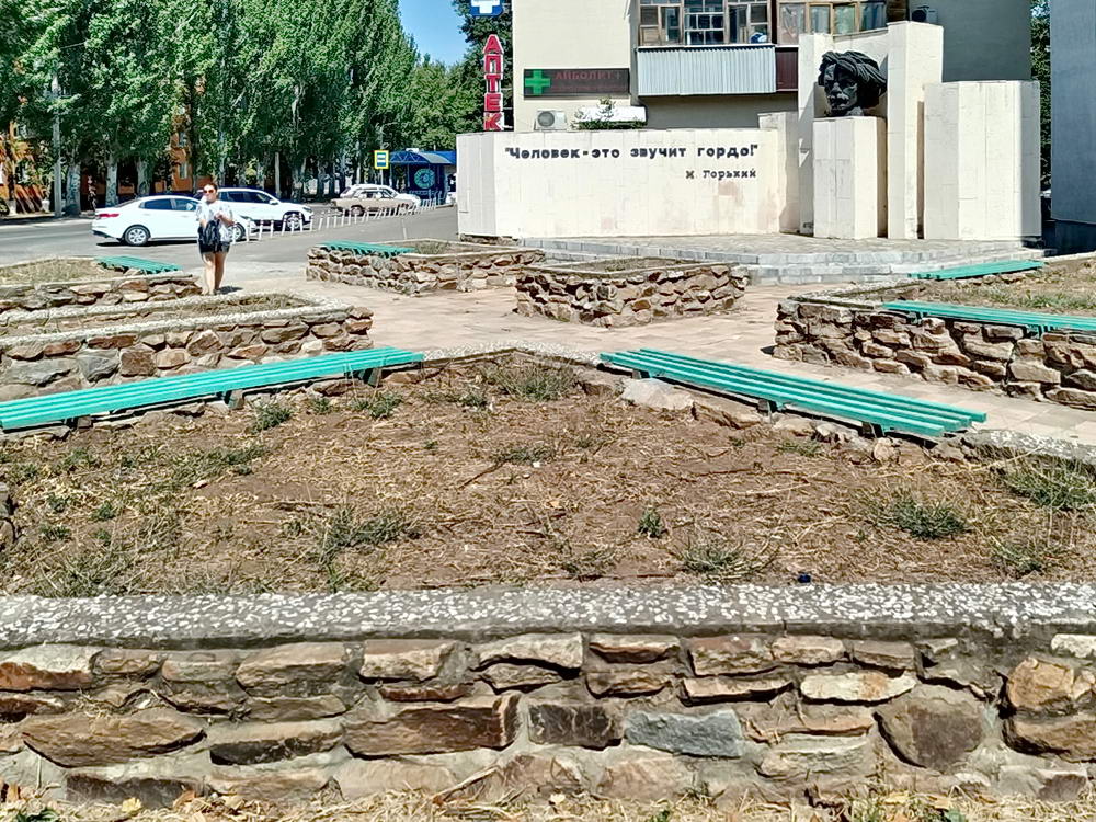 Казалось бы, что в этом месте, на перекрестке улиц Максима Горького и 50 лет СССР и должен был быть такой зелёный, уютный уголок. Есть клумбы «одетые» в камень, есть скамеечки. Но нет ни цветов, ни прочей зелени за которыми нужен не малый уход.
