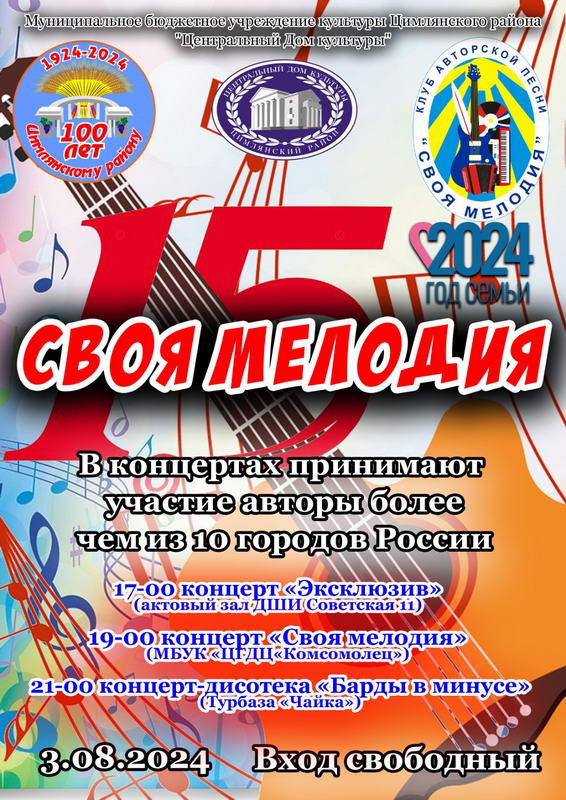 Народный коллектив КАП «Своя мелодия» известен далеко за пределами донского края. Вдохновителями большого музыкального коллектива является семья Чмых. В этом году исполняется 15 лет клубу, и организаторы планируют для любителей авторской песни провести большую интересную программу. Основные мероприятия пройдут в Цимлянске на турбазе «Чайка» с 1 по 4 августа. Здесь 2 августа с 18.00 на большой сцене начнут свое общение со зрителем музыкальные и поэтические гости Цимлянска. А после 22.00 – «Гитара у веселого костра». На следующий день 3 августа в 17.00 пройдет концерт участников торжеств в детской школе искусств Цимлянского района (ул. Советская, дом 11).