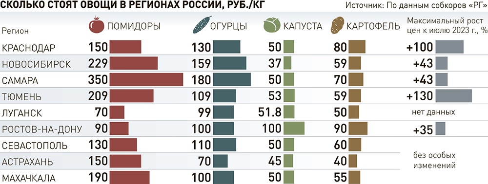 Говоря о своем регионе, депутат считает, что «проблема роста цен на овощи есть — катастрофы нет. Они повышаются довольно плавно, с колебаниями, которые носят сезонный характер, зависят от урожайности и от инфляции». И что самое важное: в регионе ведется постоянная работа с торговыми сетями, чтобы наценки на основные виды социально значимых продуктов были минимальными. Здесь тоже проводят социальные сельхозярмарки. И данные Новосибирскстата это подтверждают. По сравнению с прошлым годом здесь подорожал только картофель (на 43%). Капуста, лук и морковь, наоборот, подешевели на 32, 28 и 12% соответственно.