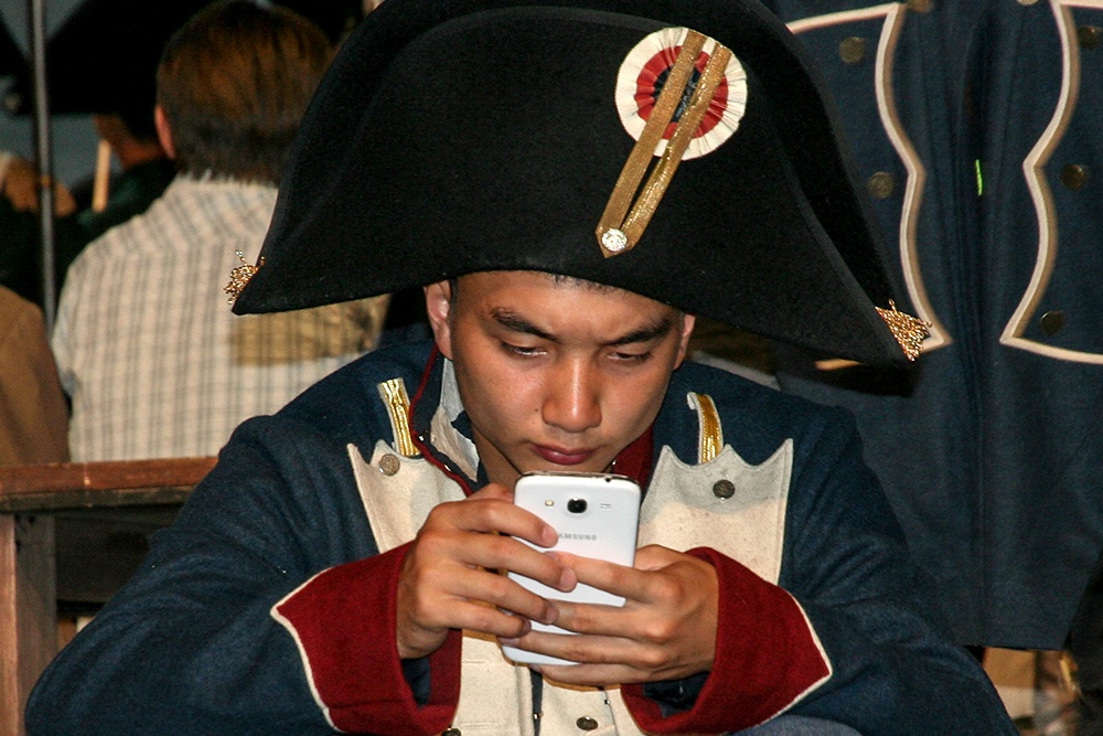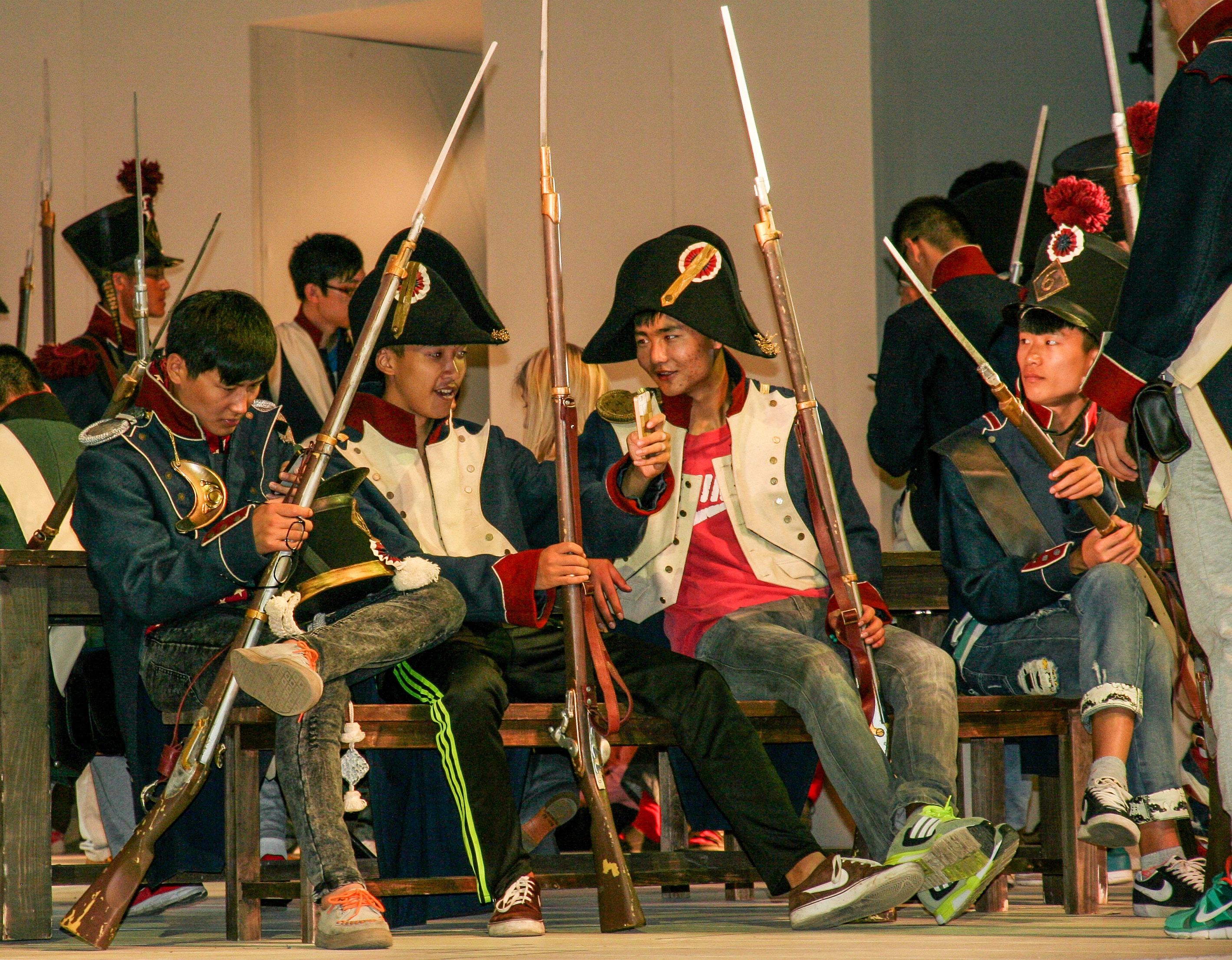 Идет натаскивание массовки: китайские студенты изобразят наполеоновскую рать. Китайцы уже в полном обмундировании — привыкают. В перерывах активно снимают мобильником селфи или сидят и о чем-то отрешенно мыслят — готовятся к курсовой. Задачи режиссера хуже кутузовских: надо обеспечить такое перемещение людских масс по сцене, чтобы возникло ощущение великого противостояния наполеоновского нахрапа и точного тактического расчета. Ни пушек, ни рукопашной, ни пожаров не будет: драма передана через музыку.