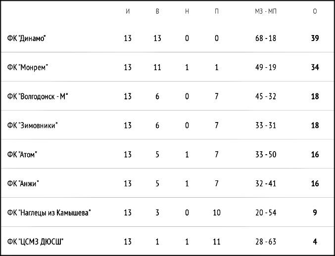 Команда ЦСМЗ ДЮСШ уступила один мяч в борьбеп с футболистами команды «Анжи». Здесь, со счётом 3: 2 выиграли футболисты клуба «Анжи» из Дубовки. Команда футбольного клуба «Зимовники» проиграла волгодонскому клубу «Динамо» со счётом 3: 5. А вот в игре волгодонских команда «Волгодонск-М» и «Морем» счёт был уж очень не футбольным. Здесь футболисты клуба «Монрем» обыграли молодых игроков городского клуба со счётом 7: 2. Команда «Наглецы из Камышина» вчстую уступили в матче с командой «Атом» — 0: 5.