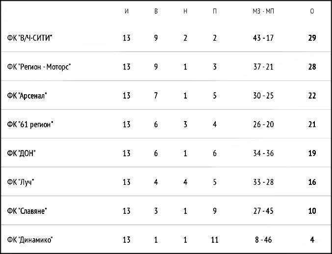 Не меньше гшолов было забито и в играх перовй лиги. Футбольный клуб «Динамико» проиграл футболистам команды «Регион Моторс» со счётом 1: 5. Неожиданно футболисты прогрессирующей команды «61 Регион» уступили «Арсеналу» со счётом 0: 3. Но больше всего голов вэтом игровом дне было забито в игре команд «В/Ч Сити» и «Луч». спортсмены воинской части выиграли у команды «Дон» со счётом 7:3. И в последнем матче игрового дня футболисты команды «Славяне» не смогли одолеть футбольный клуб «Луч». Счёт матча 2: 4.