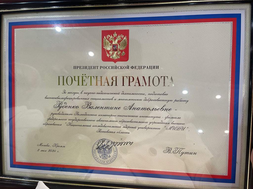 Руководителю ВИТИ НИЯУ МИФИ, доктору социологических наук, профессору Валентине Руденко Губернатор Василий Голубев вручил Почётную грамоту Президента России за заслуги в научно-педагогической деятельности, подготовке высококвалифицированных специалистов и многолетнюю добросовестную работу.