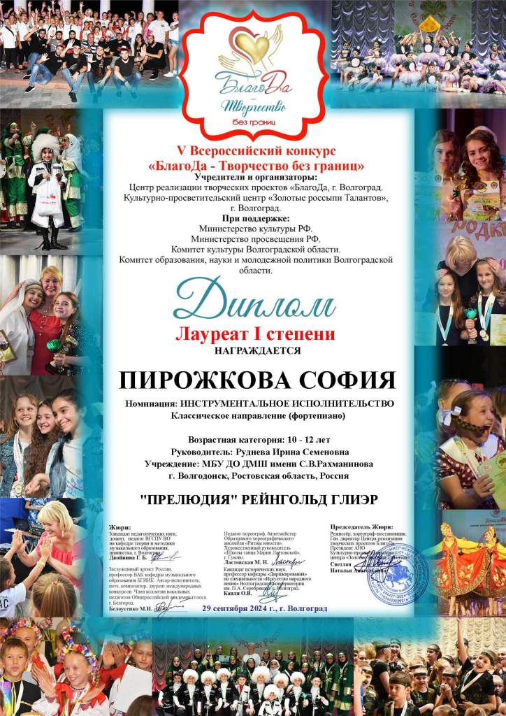 В конкурсе приняла участие учащаяся 5 класса фортепианного отделения Детской музыкальной школы имени Сергея Рахманинова Волгодонска София Пирожкова. Она виртуозно исполнила «Прелюдию» Рейнгольда Глиэра. Юная пианистка была удостоена высокой награды — диплома и кубка Лауреата I степени в номинации «Инструментальное исполнительство» (возрастная категория 10-12 лет). Подготовила победителя преподаватель Ирина Руднева. Она получила от председателя жюри конкурса благодарственное письмо «за весомый вклад в развитие творческих способностей и сохранение культурных ценностей».