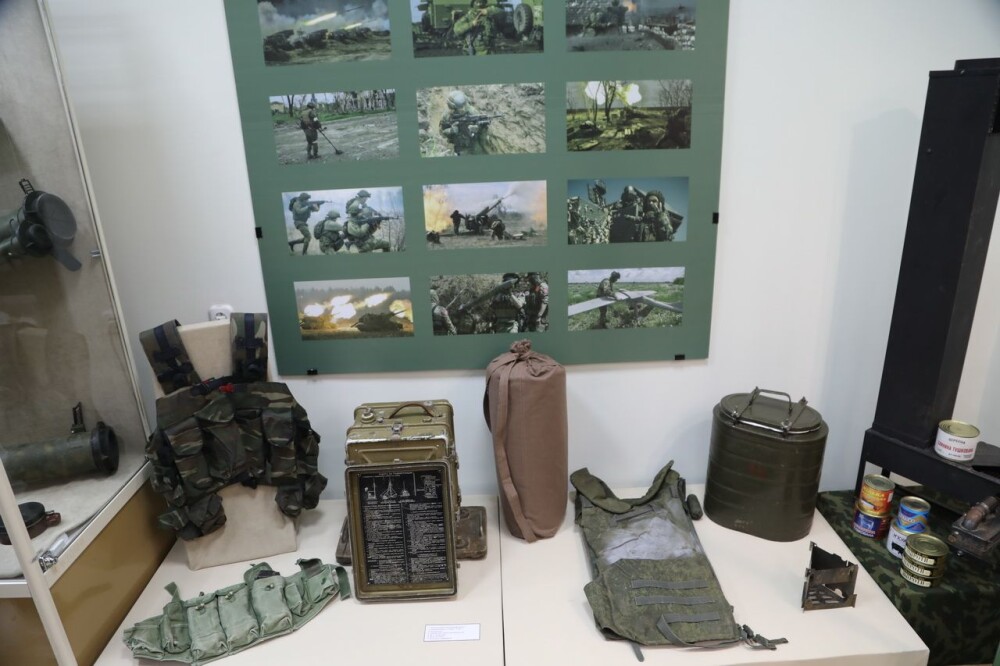 На выставке представлены награды, фотографии, документы, оружие, личные вещи наших земляков – участников специальной военной операции; флаги с автографами бойцов различных военных подразделений, привезенные волонтерами из зоны боевых действий, а также предметы, необходимые бойцам (маскировочные сети, плащ-палатка, тактические носилки, окопные свечи).