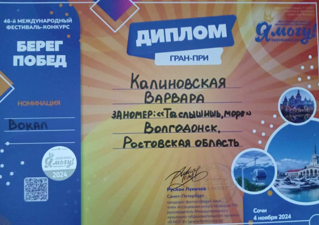 46-й Международный фестиваль-конкурс детского и юношеского творчества «Берег побед» проходил в Сочи со 2 по 5 ноября. В нём приняла участие воспитанница Детской музыкальной школы имени Сергея Рахманинова Волгодонска. Варвара Калиновская в номинации «Вокал» представила номер «Ты слышишь, море». Волгодонская звёздочка очаровала зрителей и жюри, которое высоко оценило талант, исполнительское мастерство юной вокалистки и удостоило её Гран-при.