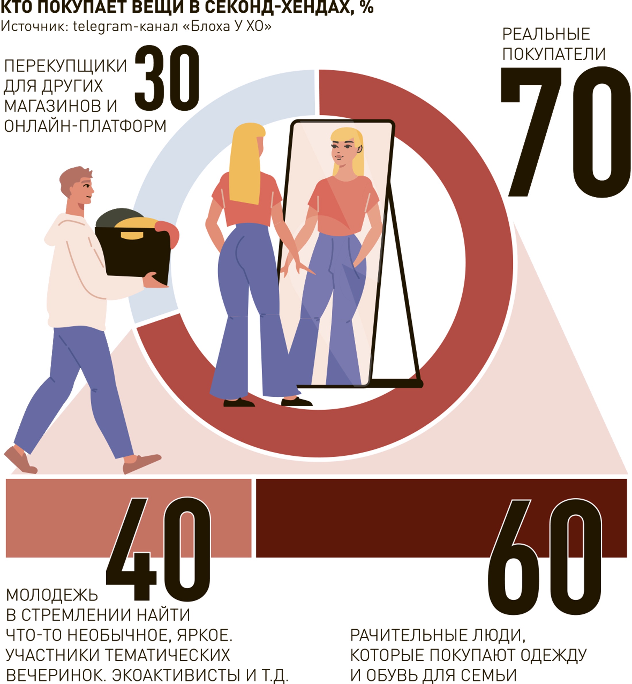 Есть и те, кто охотится за редкой, брендовой, винтажной или просто дешевой одеждой, чтобы потом перепродать ее на Авито либо уже в своем собственном магазине с наценкой. Таких перекупщиков процентов 30 от всех покупателей. Из остальных посетителей 60% — это обычные рачительные люди, покупающие одежду для работы, семьи с несколькими детьми, пенсионеры. И 40% — молодые ребята, для которых «сешка» — как раз способ купить броскую вещь или подчеркнуть свою приверженность экопотреблению.