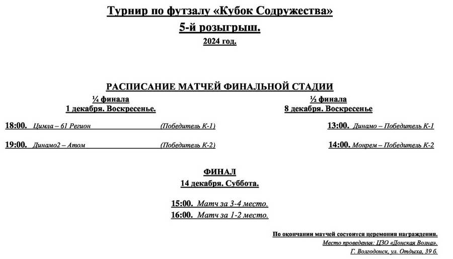 1 декабря, в Центре загороднего отдыха «Донская Волна» пройдут игры 1/4 финала Кубка «Содружества» по футзалу.