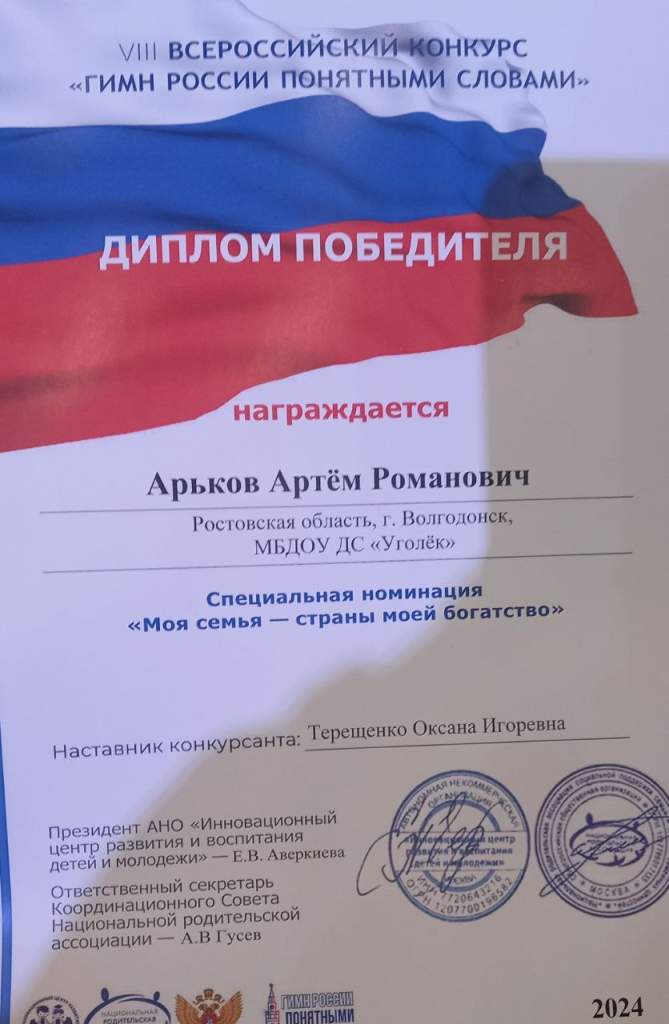 На церемонию награждения пригласили 36 победителей. В их число вошли дети из Ростовской области со своими видеороликами. Ученица школы №4 Донецка Дарья Мелюхина (наставник – Ольга Ветошенко) завоевала третье место в своей возрастной категории. Победителем в специальной номинации «Моя семья – страны моей богатство» стал Артём Арьков — воспитанник детского сада «Уголек» из Волгодонска. В первой возрастной категории он представил видеоролик под руководством Оксаны Терещенко.