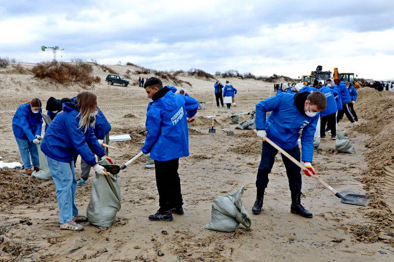 Именно золотые пески Анапы оказались в эпицентре техногенного ЧП. Особенно пострадали участки берега в поселке Витязево. В оперативном штабе, координирующем действия волонтеров, нас направляют на пляж «Лазурный берег», где работы по расчистке ведутся с раннего утра. Место славится своей ухоженностью и близостью дорогих отелей. Вместительная стоянка на въезде забита автотранспортом, из медленно подкатывающих автобусов высыпают добровольцы — сотрудники предприятий и организаций разных городов региона — берут лопаты, перчатки и двигаются к полоске зимнего моря.
