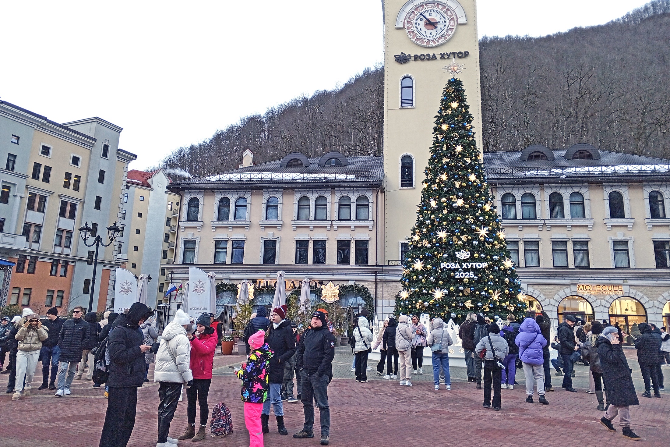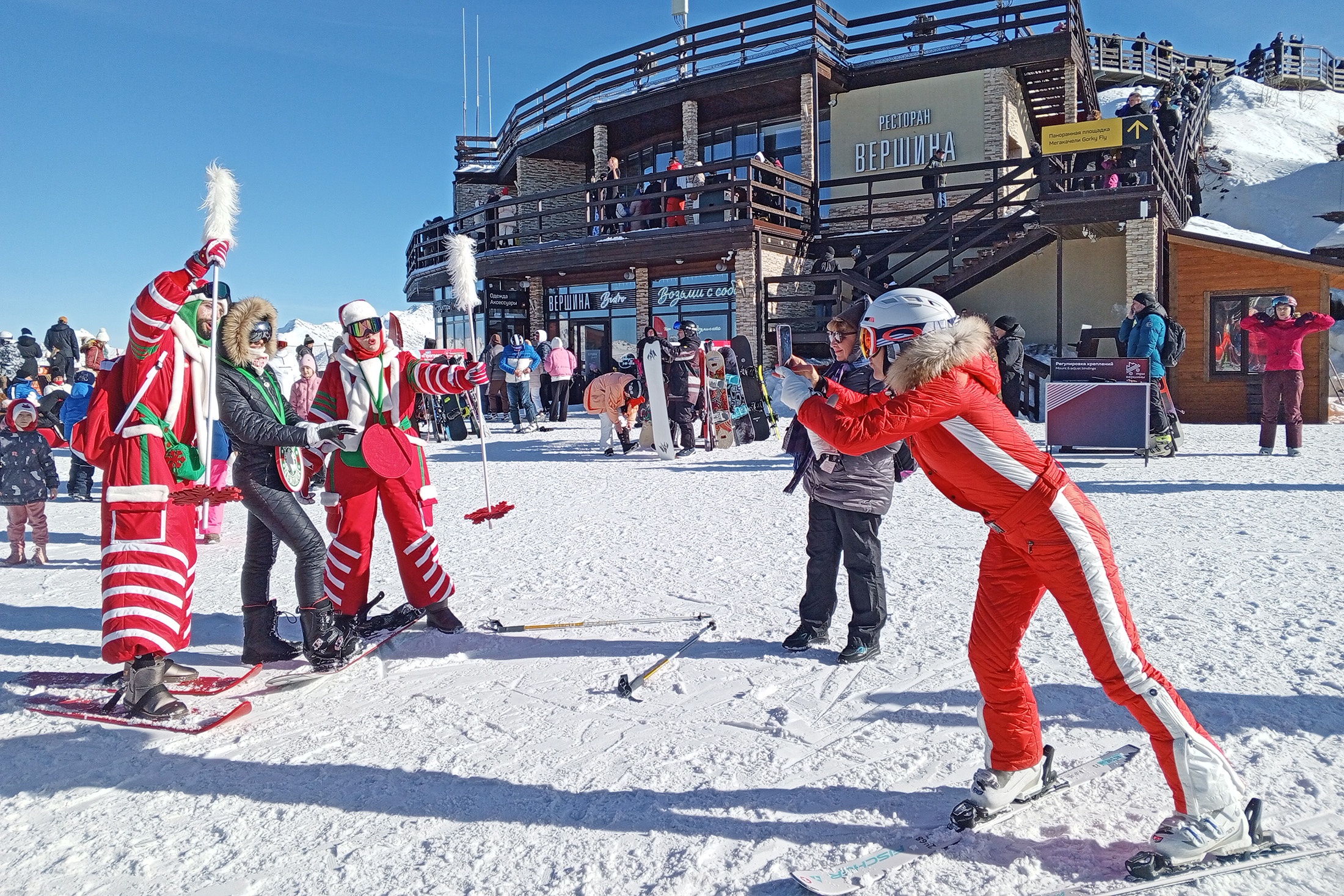 Поэтому хочется двигаться, а не стоять на месте. На панорамной площадке, расположенной на высоте 2200 метров над уровнем моря, много гостей. «Ски-пасс стоит пять тысяч рублей, а лыжи я взял на прокат за тысячу, но не на самом курорте — за пределами дешевле. Снега на склонах масса, почти все трассы открыты. Я катаюсь с шести лет, сейчас мне 21. Начинал в Италии, но в Сочи даже лучше: нет проблем с логистикой — прямой перелет, к тому же не нужно учить иностранный язык», — объяснил горнолыжник из Калининграда в костюме жирафа Даниил, прилетевший на курорт с родителями.