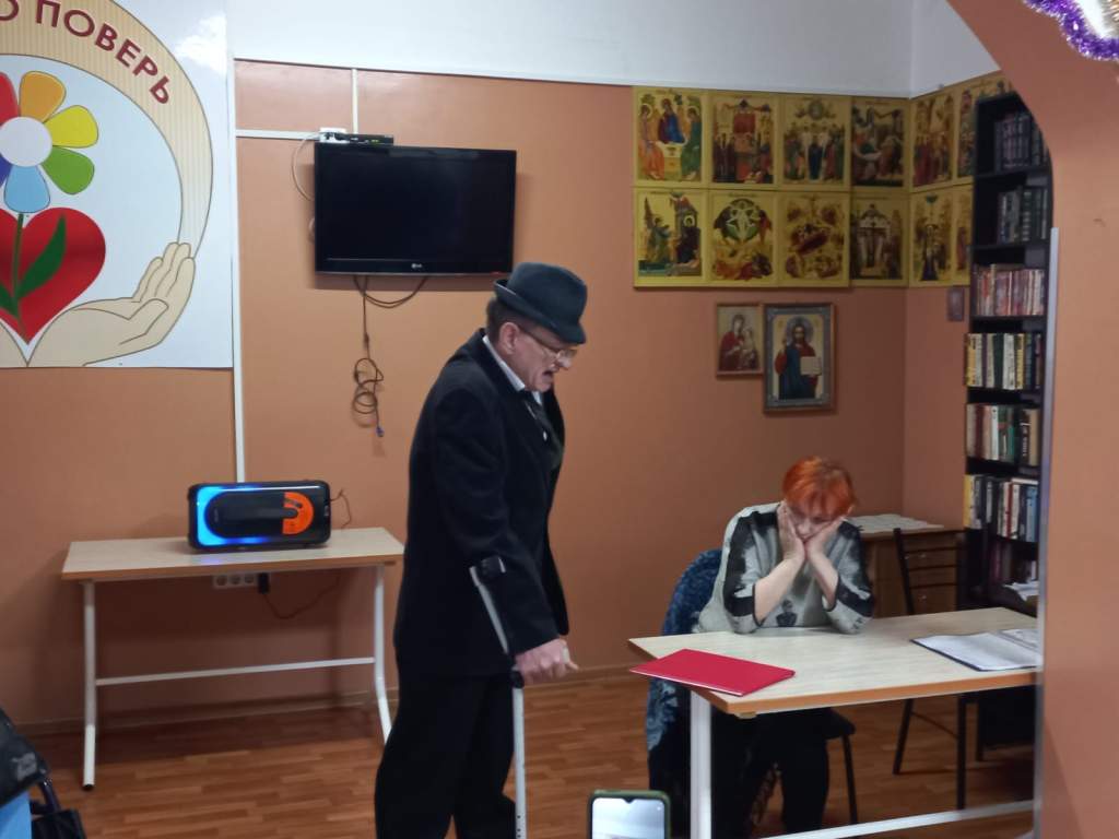 «Сказка о рыбаке и рыбке» — в стиле аллегории , то есть актеры в результате пьесы прорабатывают негативные отражения, которые их беспокоят. Готовили спектакль мы месяц. Когда начинали, наши артисты были какими-то потухшими, едва терпели друг друга, а сейчас — это слаженный коллектив. Они и о болячках своих меньше думают, глаза горят — что бы ещё поставить, каким делом заняться. Вот Роман Валентинович, который Деда Мороза играл, собирается в церкви петь — у него красивый баритон.