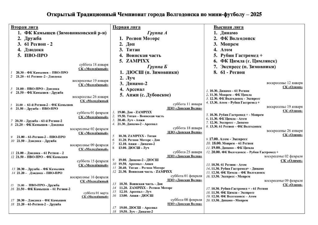 В высшей лиге чемпионата Волгодонска по мини-футболу в этом сезоне заявились восемь команд. Это «Динамо», Ф/К «Волгодонск», «Монрем», «Атом», «Рубин Гастромед+», Ф/К «Цимла», «Экспресс» (Зимовники), «61 Регион». В высшей лиге игры пройдут, как обычно в спортивном комплексе «Олимп» с 12 января по 2 марта.
