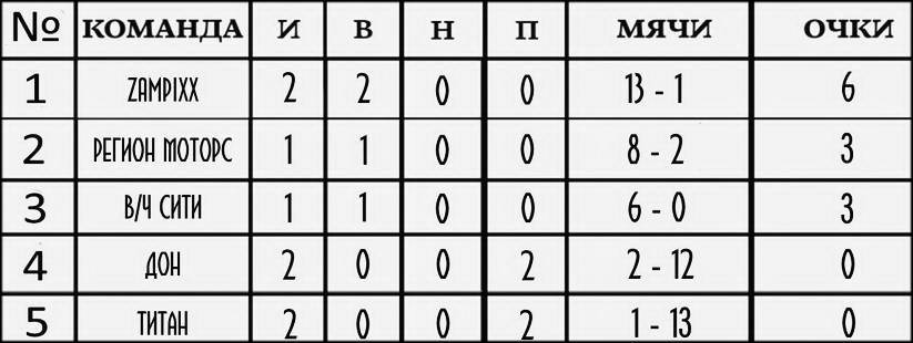 В первой игре новая команда лиги «ZFMPIXX» убедительно победила команду «Титан» со счётом 7:1. Ещё больше голов было забито в матче команд «Регион Моторс» и «Дон», где регионовцы забили восемь мячей в ворота соперников пропустив в свои лишь два. Итого этого интересного матча 8: 2.