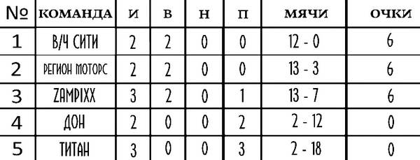 | 5 | 61 регион | 3 | 1 | 0 | 2 | 7-13 | 3 |