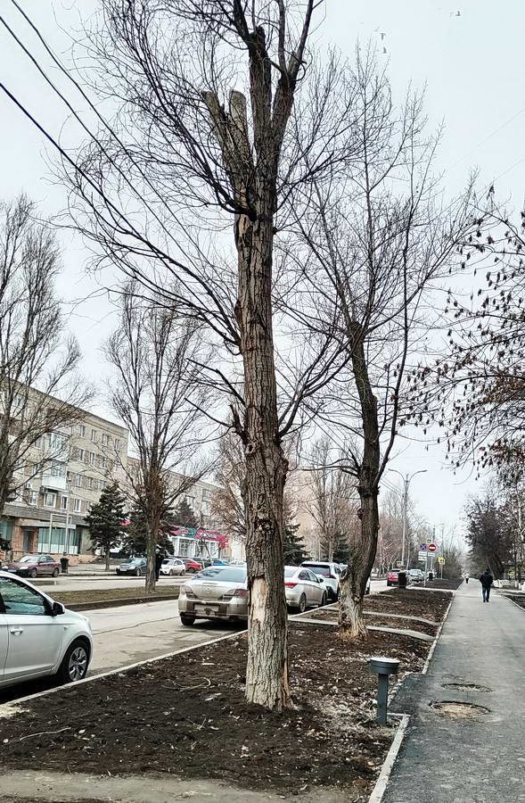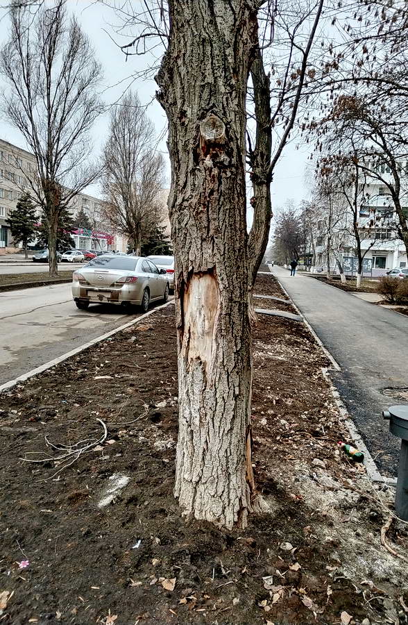Вот, что происходит с деревом срезы которого не обработаны, да и само дерево было обрезано под «столб». И таких деревьев на главной улице старого города – Ленина – десятки. «Промучаясь» несколько лет в итоге такое дерево гибнет.