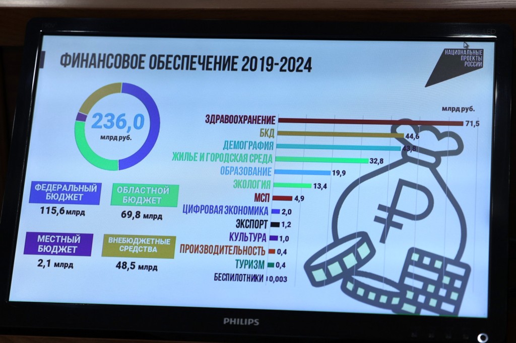 В рамках национальных проектов в Ростовской области разработали 42 региональных. На них предполагается потратить за год 51,2 млрд рублей, из которых 28,6 миллиарда поступят из федерального бюджета, 20,5 миллиарда – из областного.