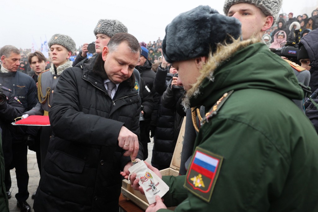 На церемонии также стартовала акция «Земля Героев», организованная Южным военным округом. Юрий Слюсарь, как и остальные участники акции, наполнил кисет горстью земли с мест ожесточенных сражений, которые проходили в Ростовской области – в Неклиновском, Октябрьском сельском и в Тацинском районах.