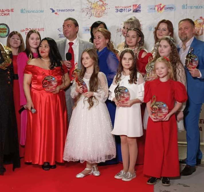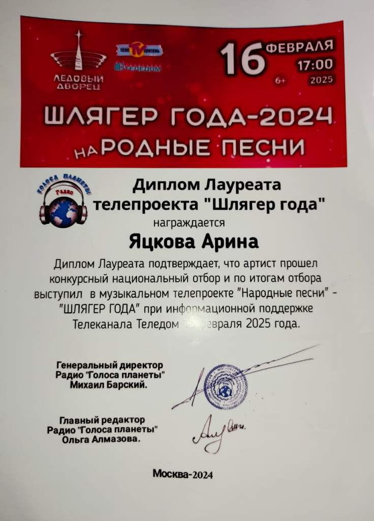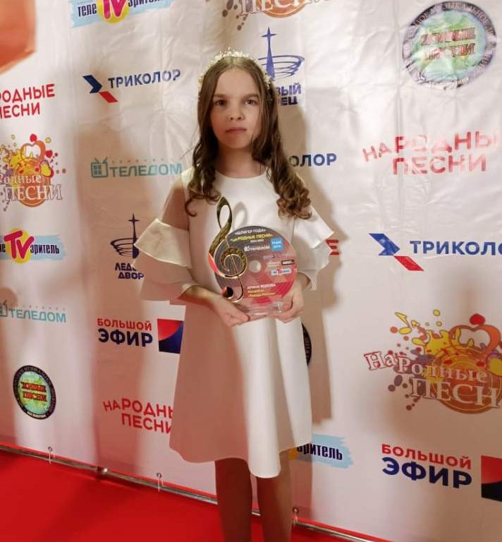 Воспитанница преподавателя Татьяны Ляшевой исполнила три композиции. После выступления Арине вручили памятные статуэтки «Шлягер года. НаРодные песни» и телепремию «Города России».