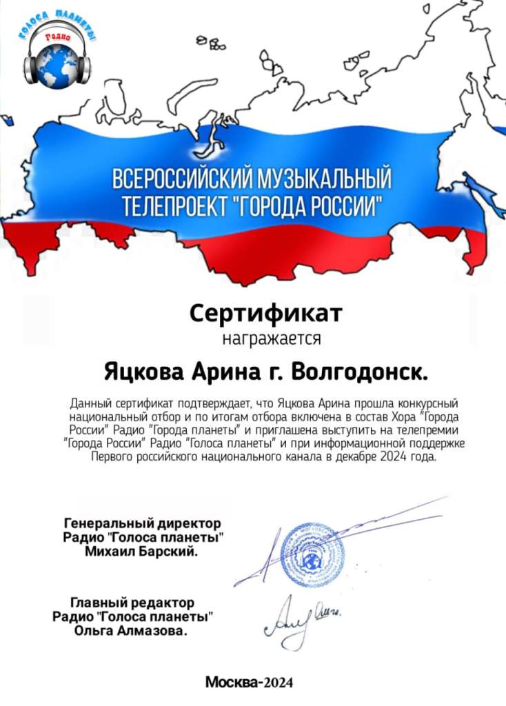 В Ледовом дворце Санкт-Петербурга 16 февраля состоялась съёмка в формате концерта «Шлягер года. НаРодные песни» при поддержке федерального канала Теледом. На сцене выступали Татьяна Буланова, Игорь Наджиев, Светлана Рерих, «Шарман», Афина и другие известные российские артисты. Участвовали 20 детских коллективов со всей страны, в том числе ансамбль «Города России». В него входят юные солисты из разных городов. Волгодонск представляет ученица музыкальной школы имени С. В. Рахманинова Арина Яцкова. Она призналась, что для неё это выступление — огромная честь и ответственность.