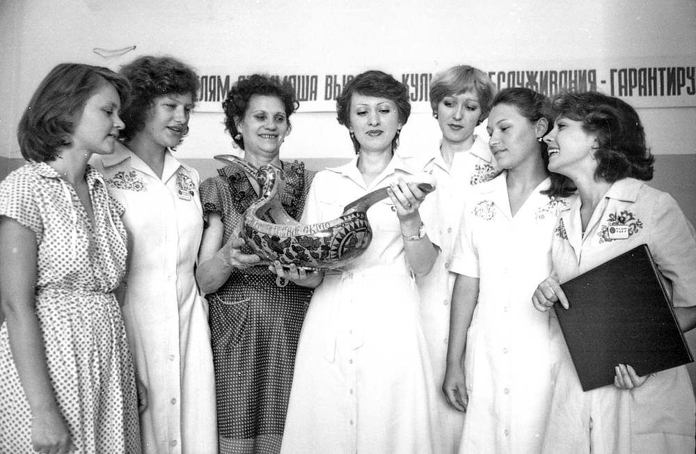 Эту награду здесь принимали как победители областного социалистического соревнования среди сквозных комсомольско-молодежных смен, участвующих в обслуживании строителей Всесоюзной ударной комсомольской стройки — «Атоммаша». На снимке: (слева направо) с почетным призом «Работницы» молодые продавцы О. КНЯЗЕВА, Н. БЕЛОВА, Л. КАЛЮЖНАЯ, секретарь комитета комсомола, Н. ДУДИЧ, Т. ПРОЦЕНКО